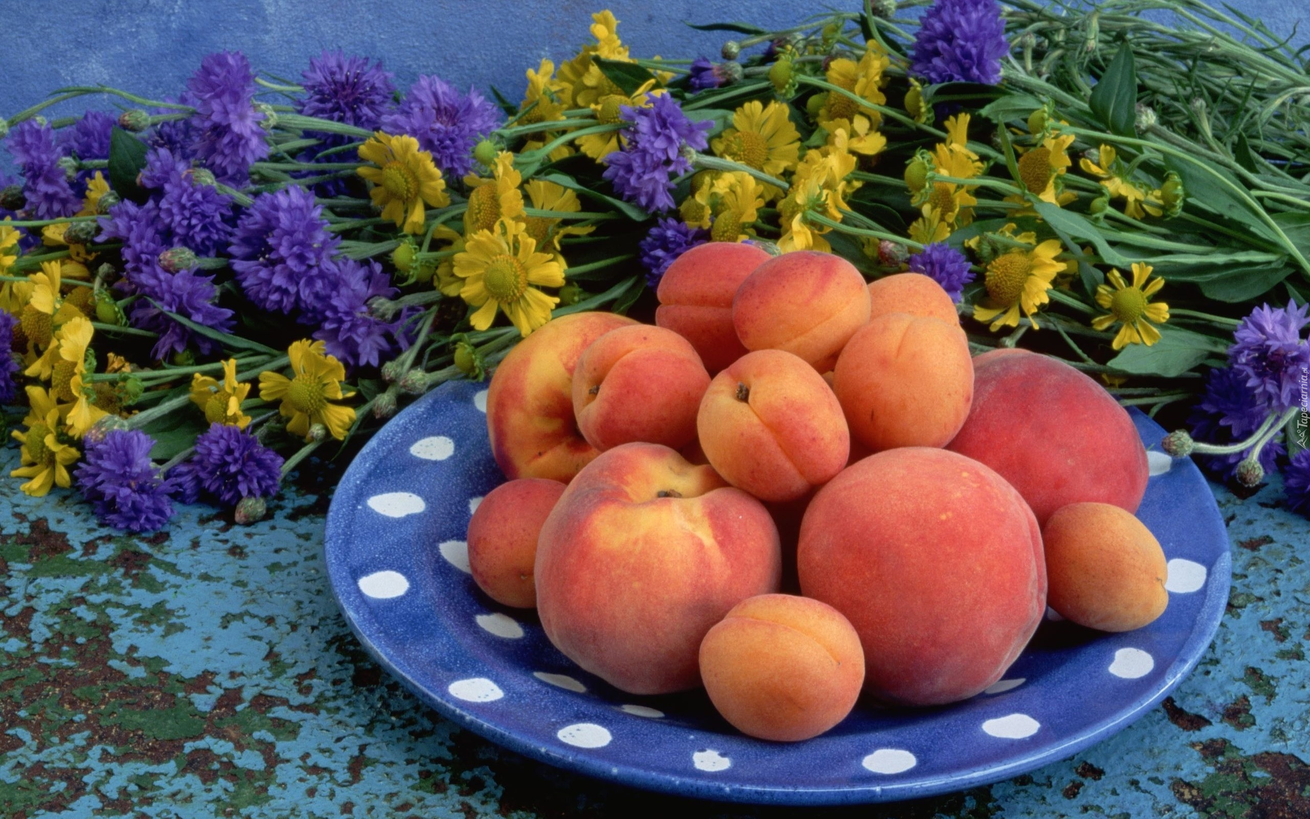 Edytor tapety: Brzoskwinie, Talerzyk, Żółte, Fioletowe, Kwiaty