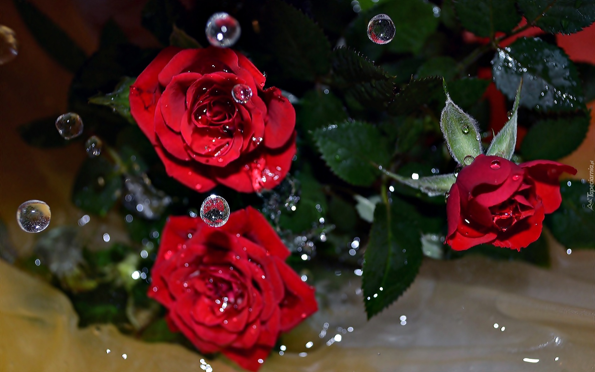Edytor tapety: Trzy, Czerwone, Róże, Krople, Wody
