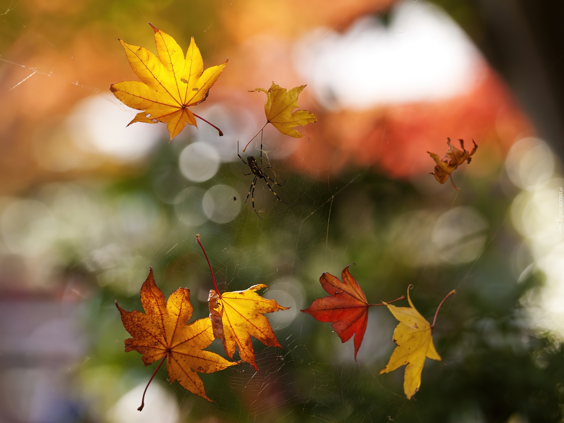 Edytor tapety: Jesienne, Liście, Pająki, Pajęczyna, Rozmycie