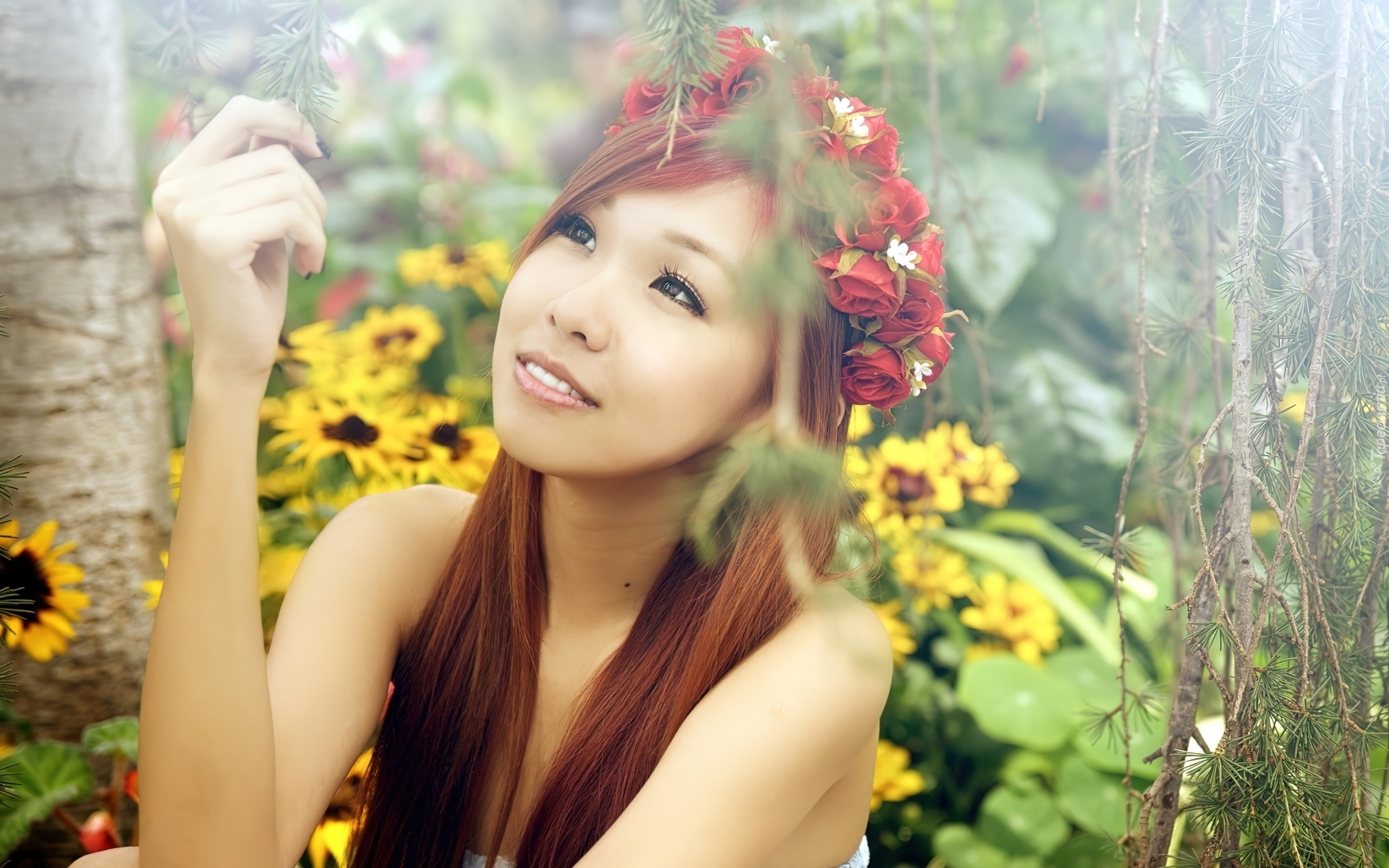 Edytor tapety: Kobieta, Kwiaty, Słoneczniki, Róże, Wianek