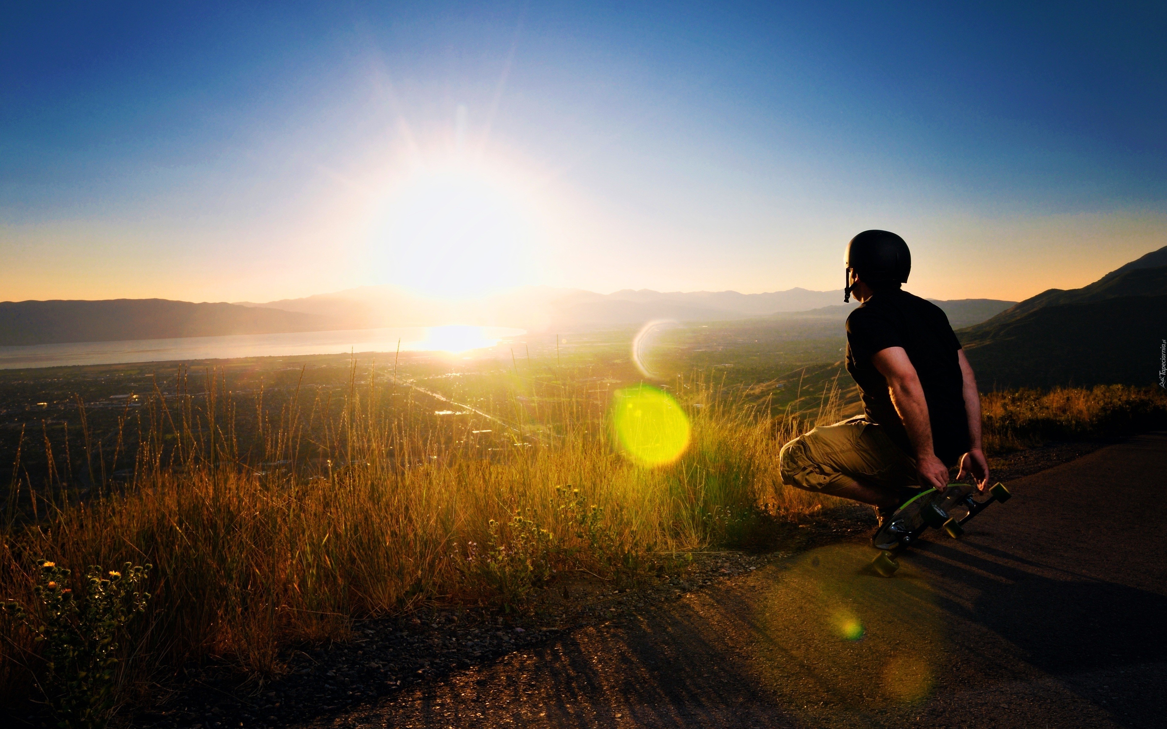 Edytor tapety: Promienie, Słońca, Jezioro, Łąki, Mężczyzna, Deskorolka