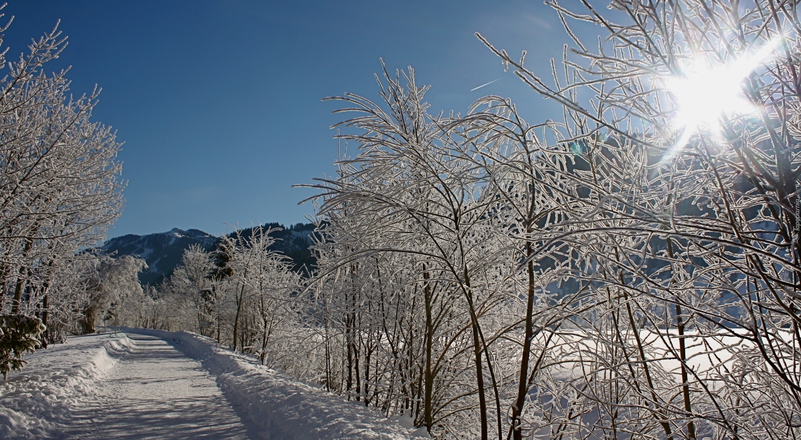 Edytor tapety: Drzewa, Droga, Promienie, Słońca, Zima