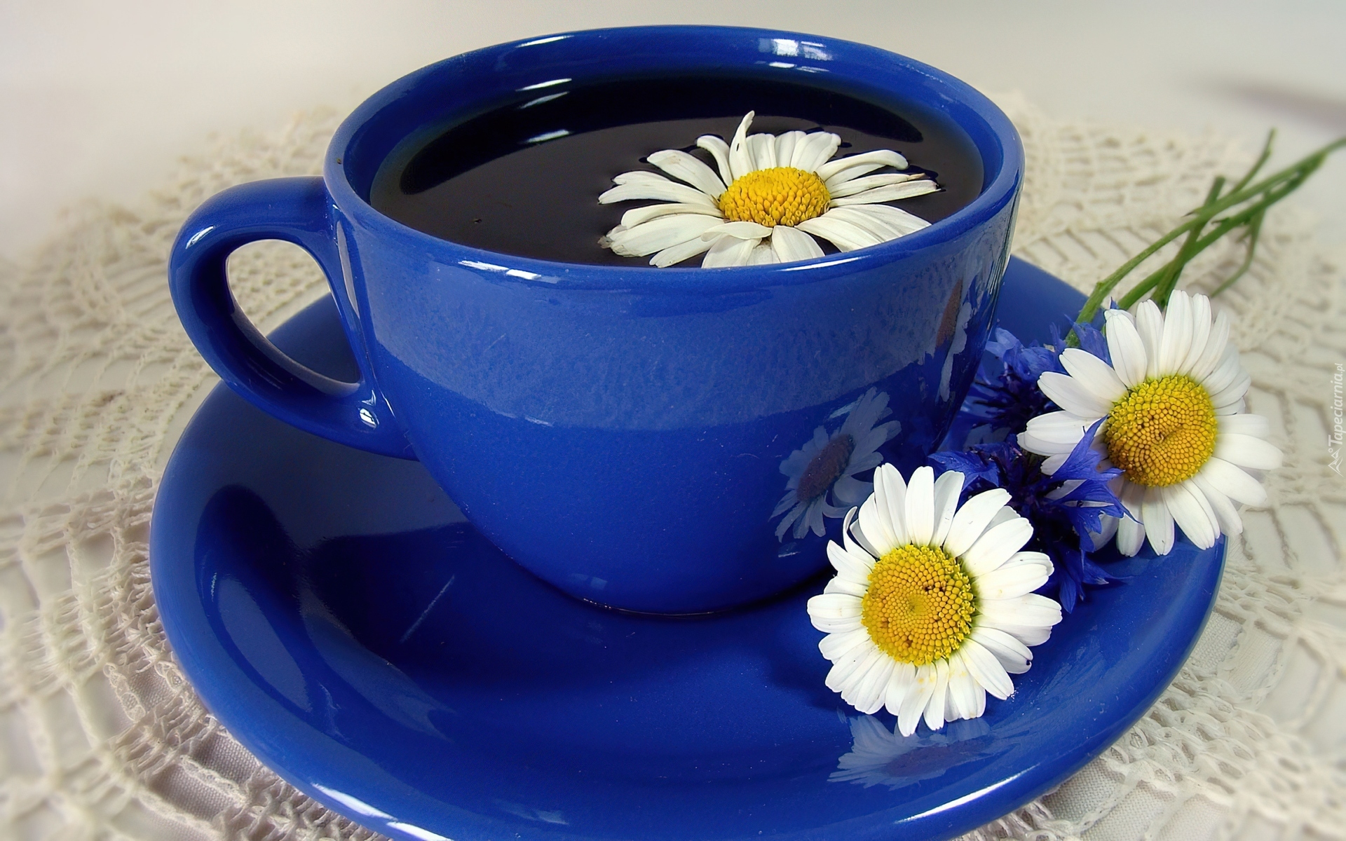 Edytor tapety: Niebieska, Filiżanka, Talerzyk, Herbata, Rumianek