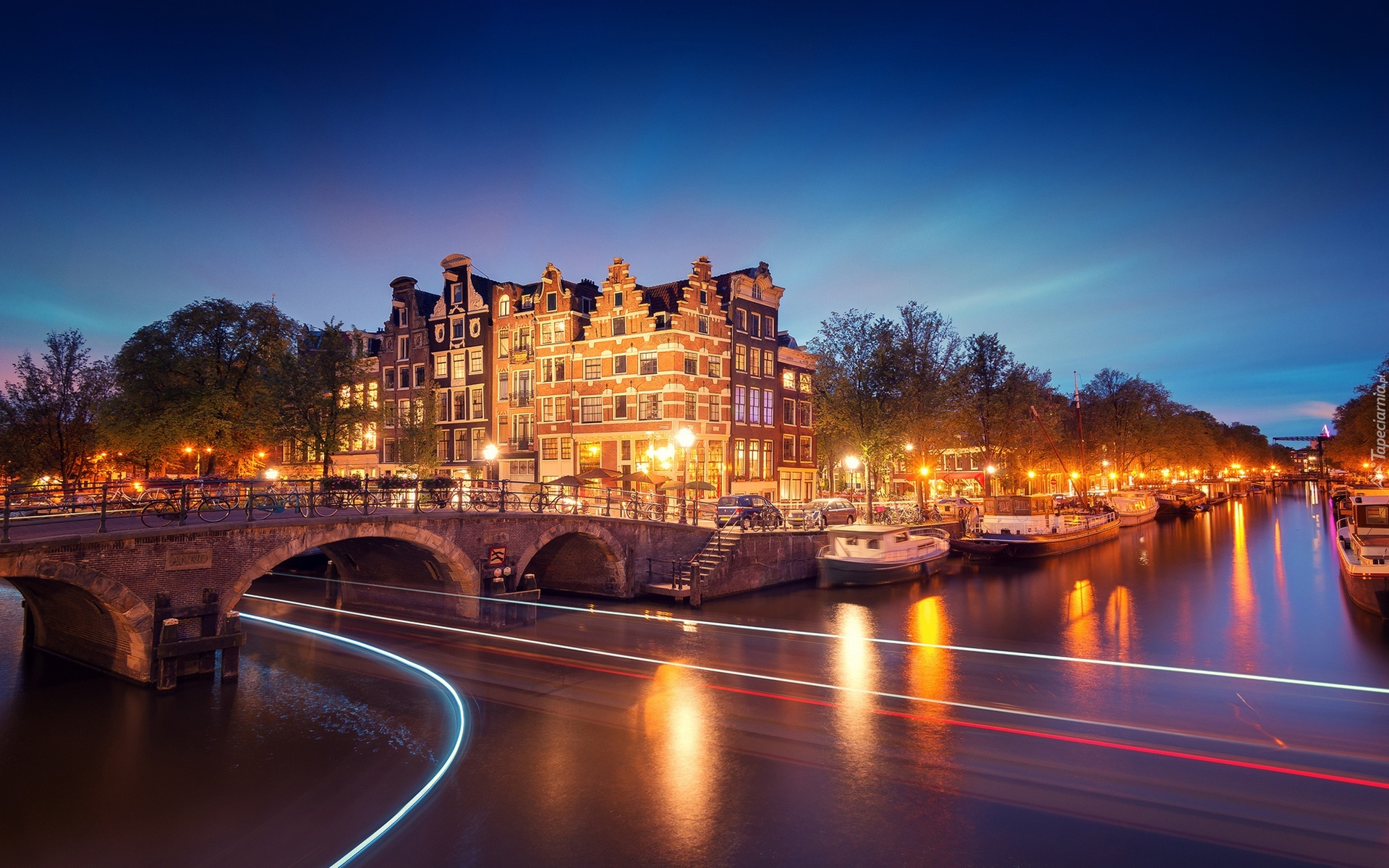 Edytor tapety: Rzeka, Most, Budynki, Łodzie, Barki, Amsterdam, Holandia, Noc
