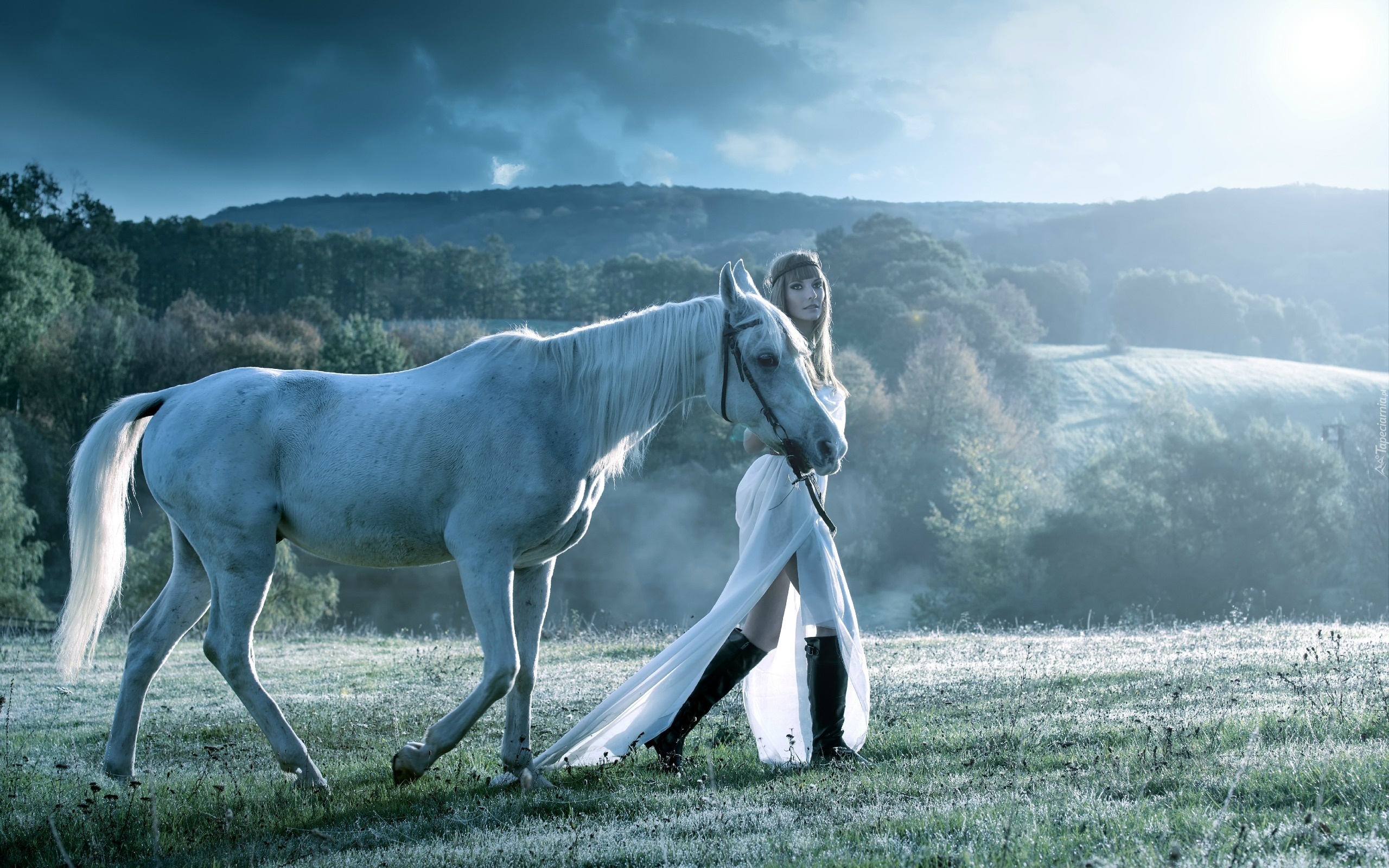 Edytor tapety: Koń, Kobieta, Łąka, Mgła, Góry, Lasy, Poranek