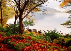 Edytor tapety: Rzeka, Góry, Lasy, Kamienie, Kolorowe, Liście, Jesień