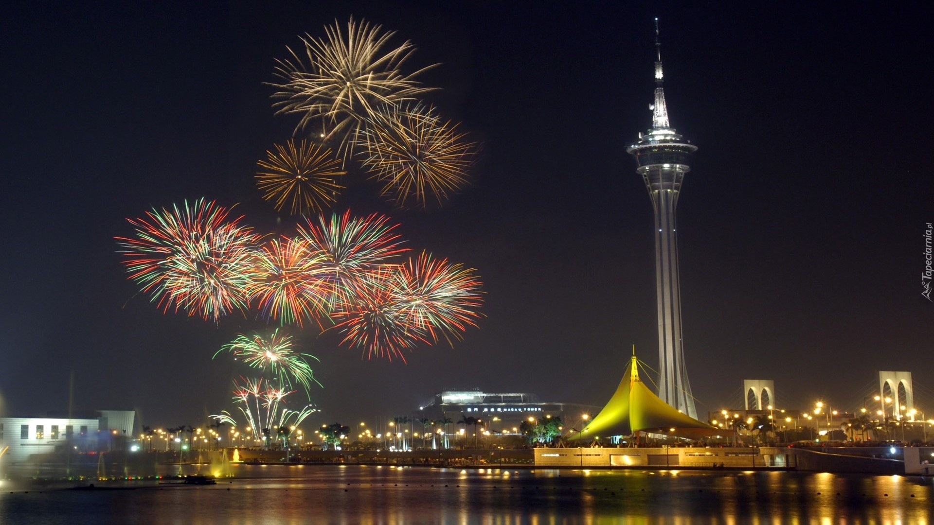Edytor tapety: Wieża, Fajerwerki, Noc, Macao, Chiny