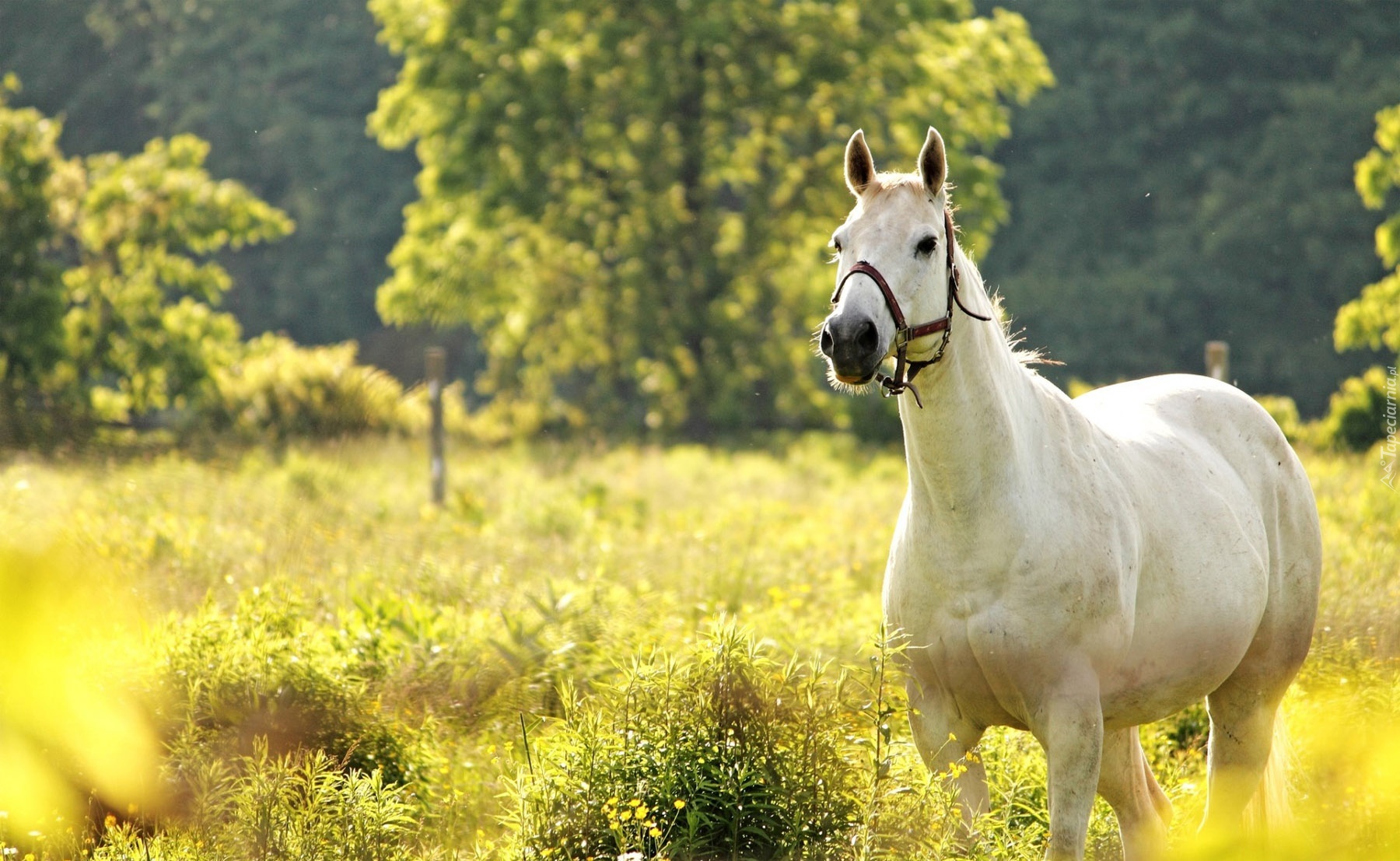 Edytor tapety: Koń, Łąka, Żółte, Kwiatki