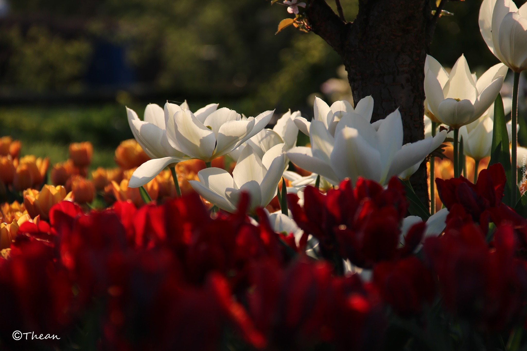 Edytor tapety: Białe, Tulipany, Drzewo