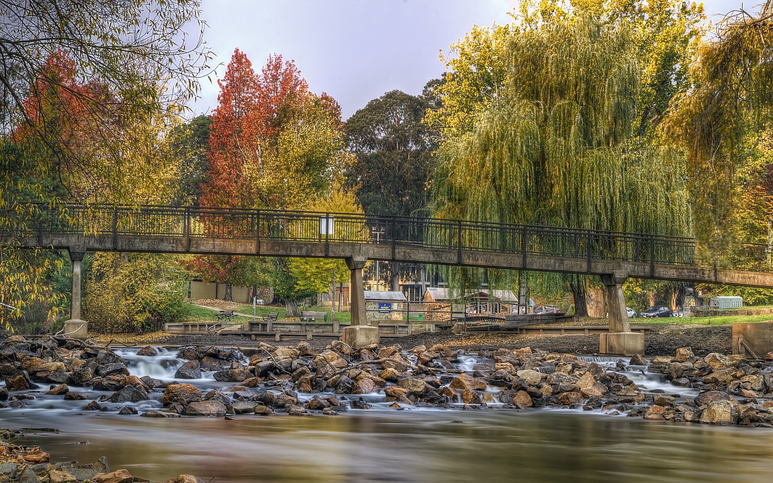 Edytor tapety: Rzeka, Kamienie, Most, Drzewa, Budynki