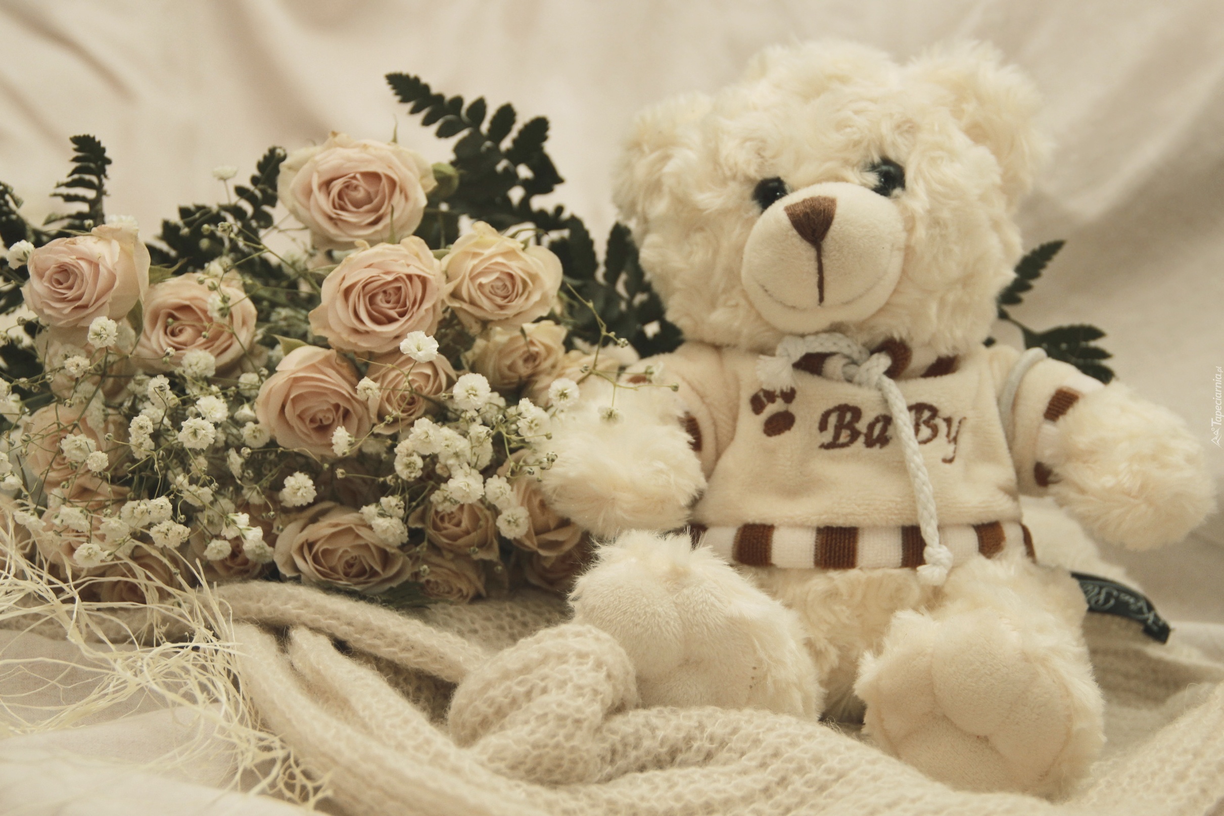 Edytor tapety: Bukiet, Róż, Biały, Miś