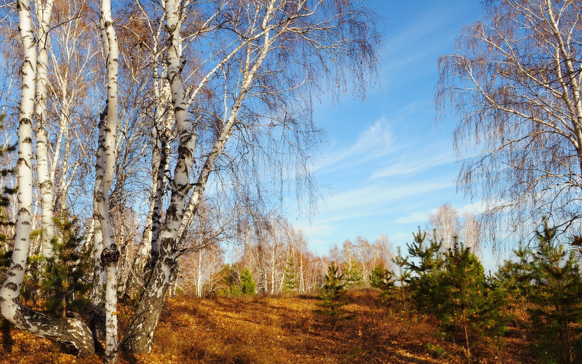 Edytor tapety: Las, Brzozy, Liście, Ścieżka, Jesień