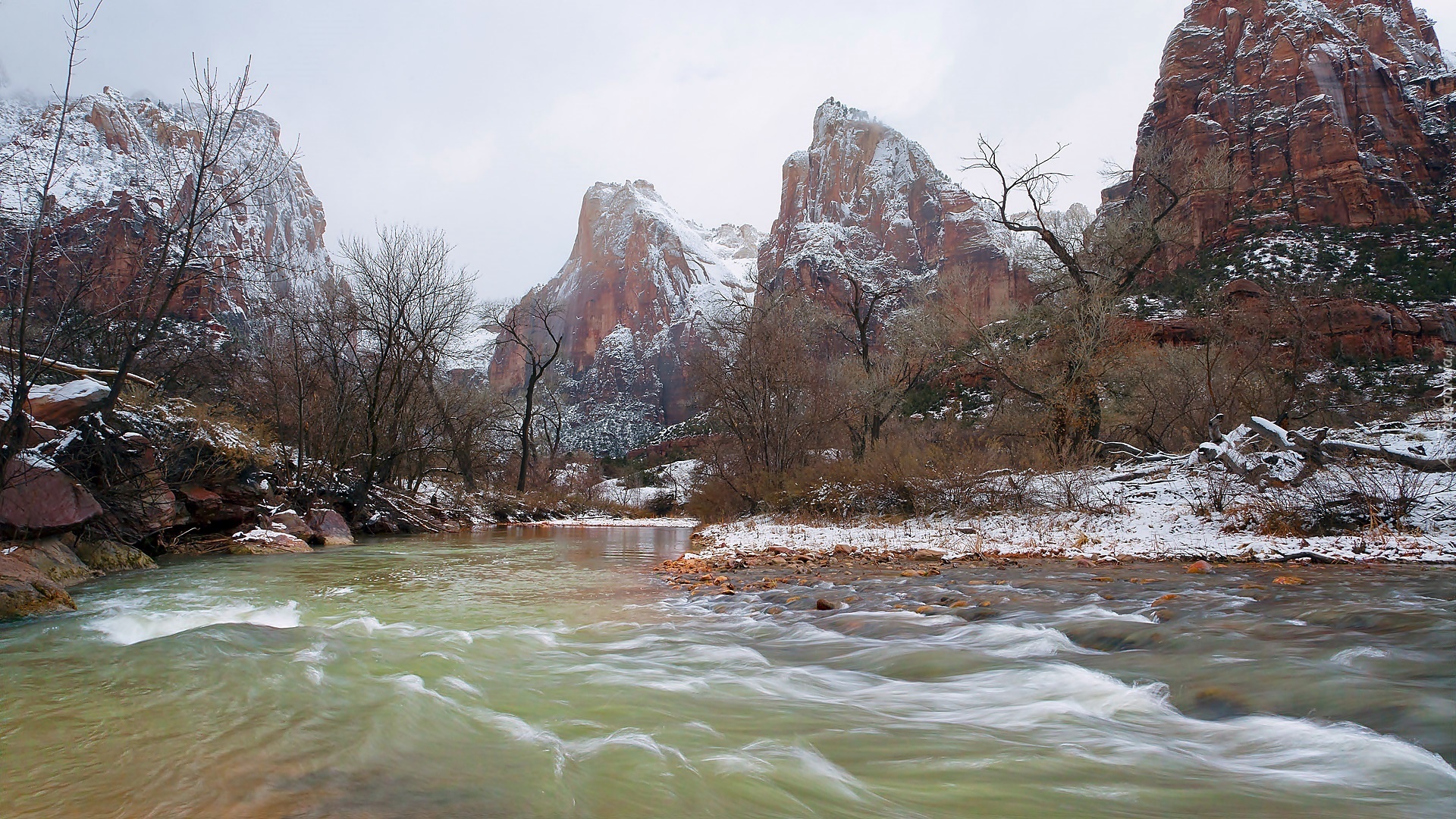 Edytor tapety: Ośnieżone, Skały, Rzeka, Drzewa