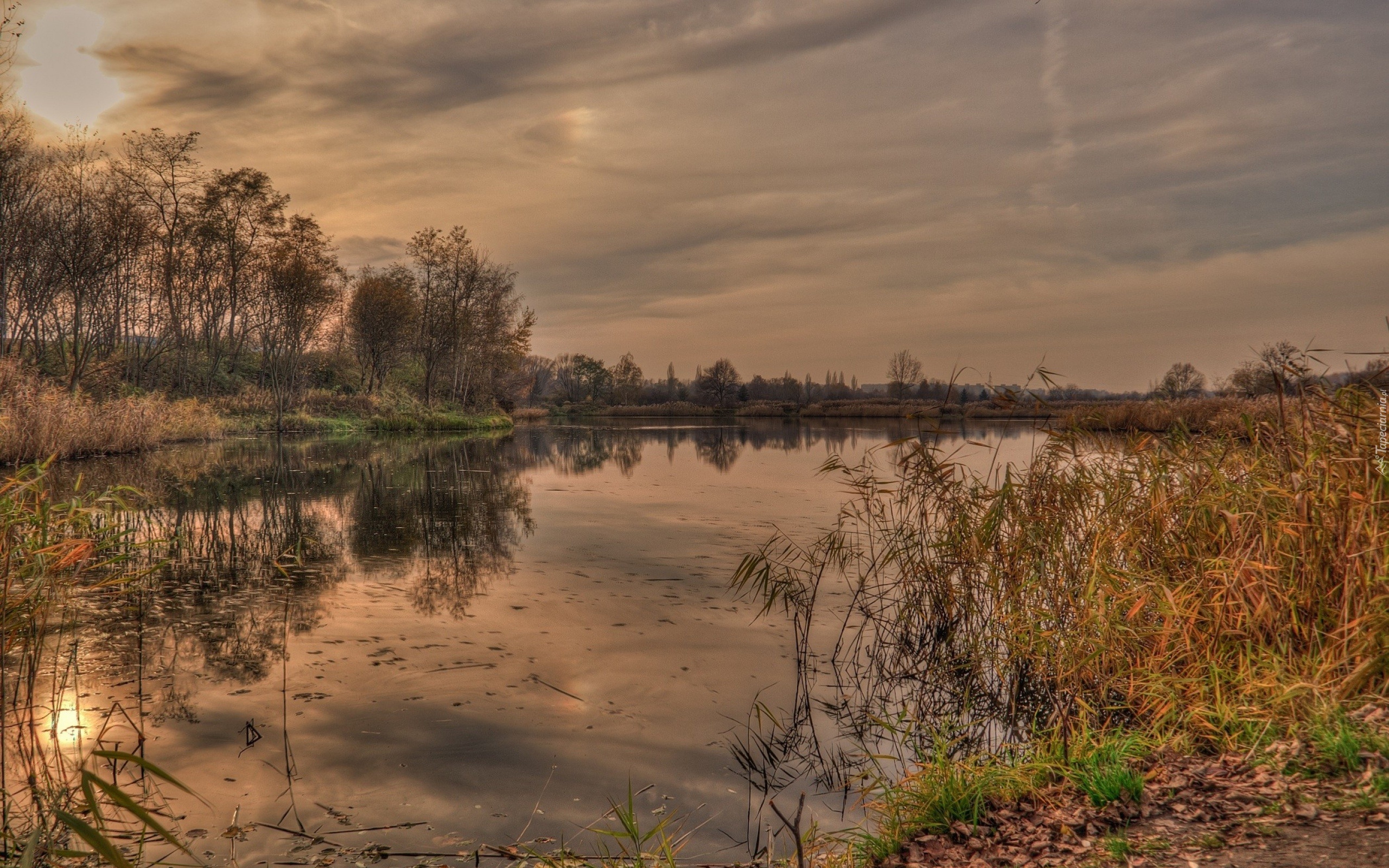 Edytor tapety: Zachód, Słońca, Jezioro, Roślinność