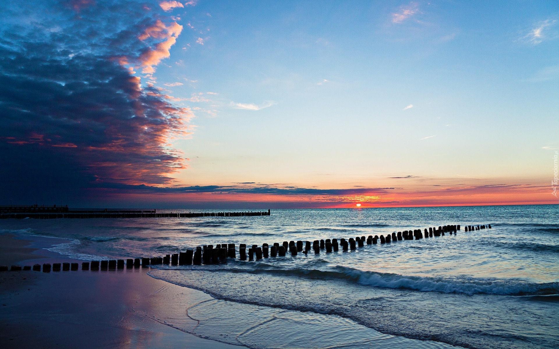 Edytor tapety: Wybrzeże, Pale, Fale, Chmury, Zachód, Słońca