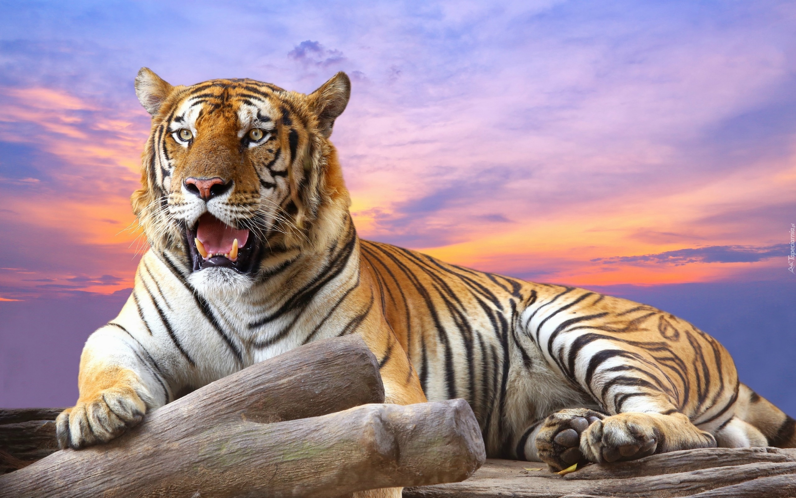 Edytor tapety: Tygrys, Drzewo, Zachód, Słońca