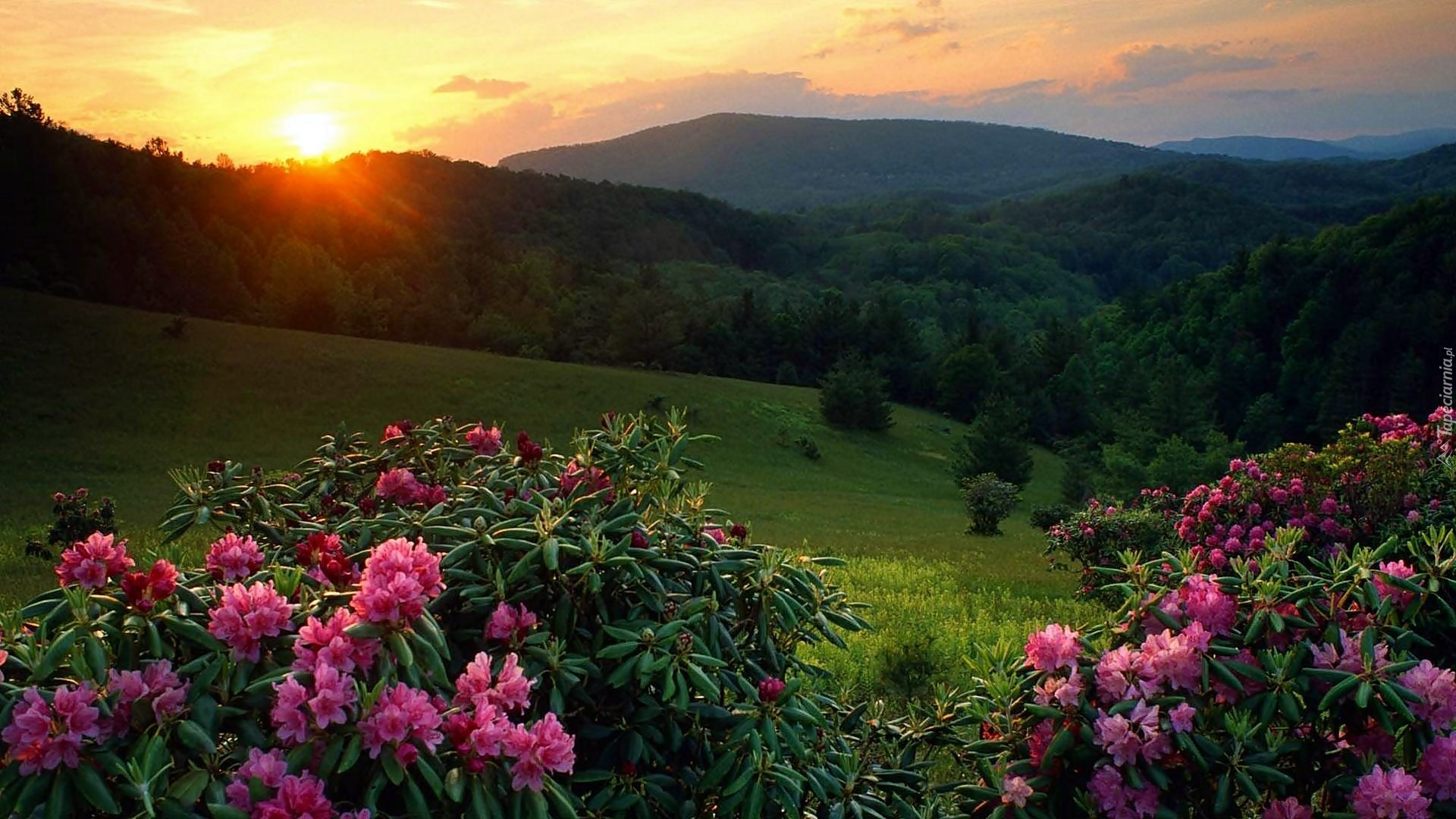 Edytor tapety: Wzgórza, Lasy, Zachód, Słońca, Kwitnące, Rododendrony