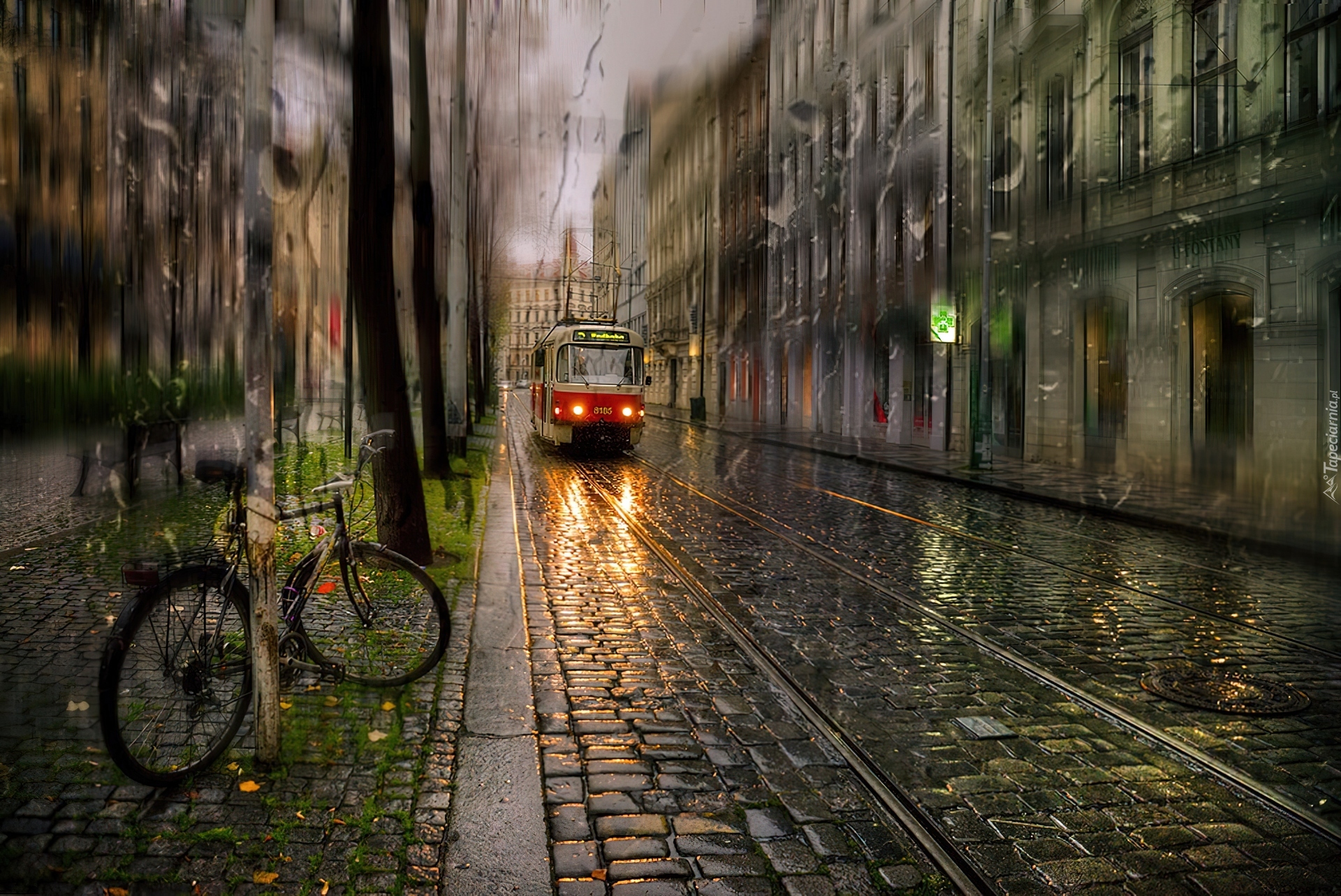 Edytor tapety: Miasto, Wieczór, Tramwaj, Rower, Ulica, Tory