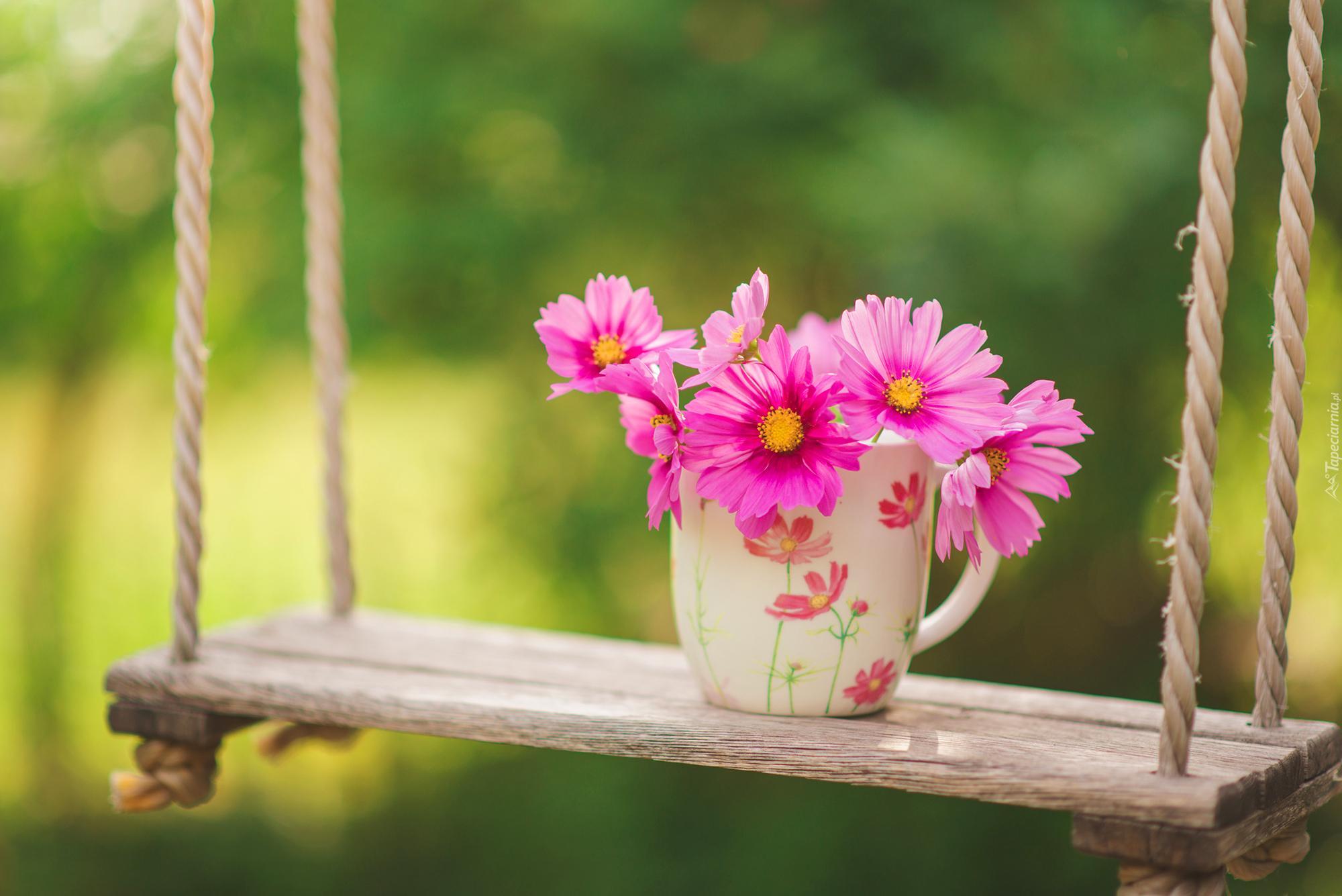 Edytor tapety: Huśtawka, Kubek, Kwiatuszki, Ogród