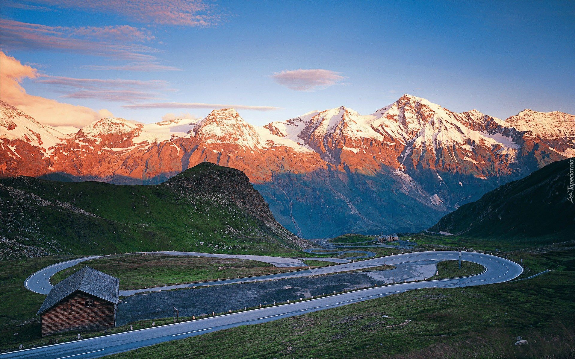 Edytor tapety: Alpy, Zachód, Słońca, Serpentyna