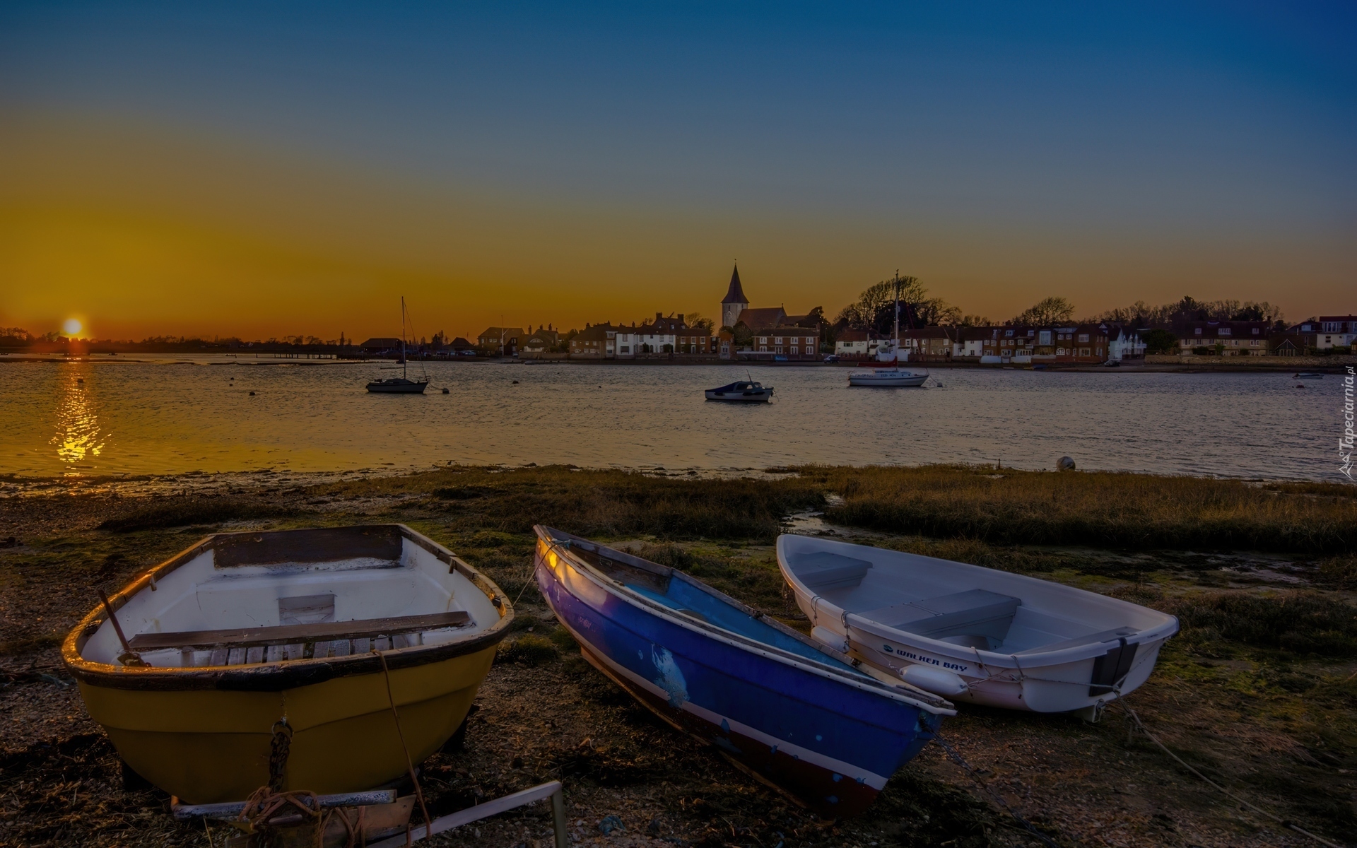 Edytor tapety: Zachód, Słońca, Zalew, Łodzie, Brzeg