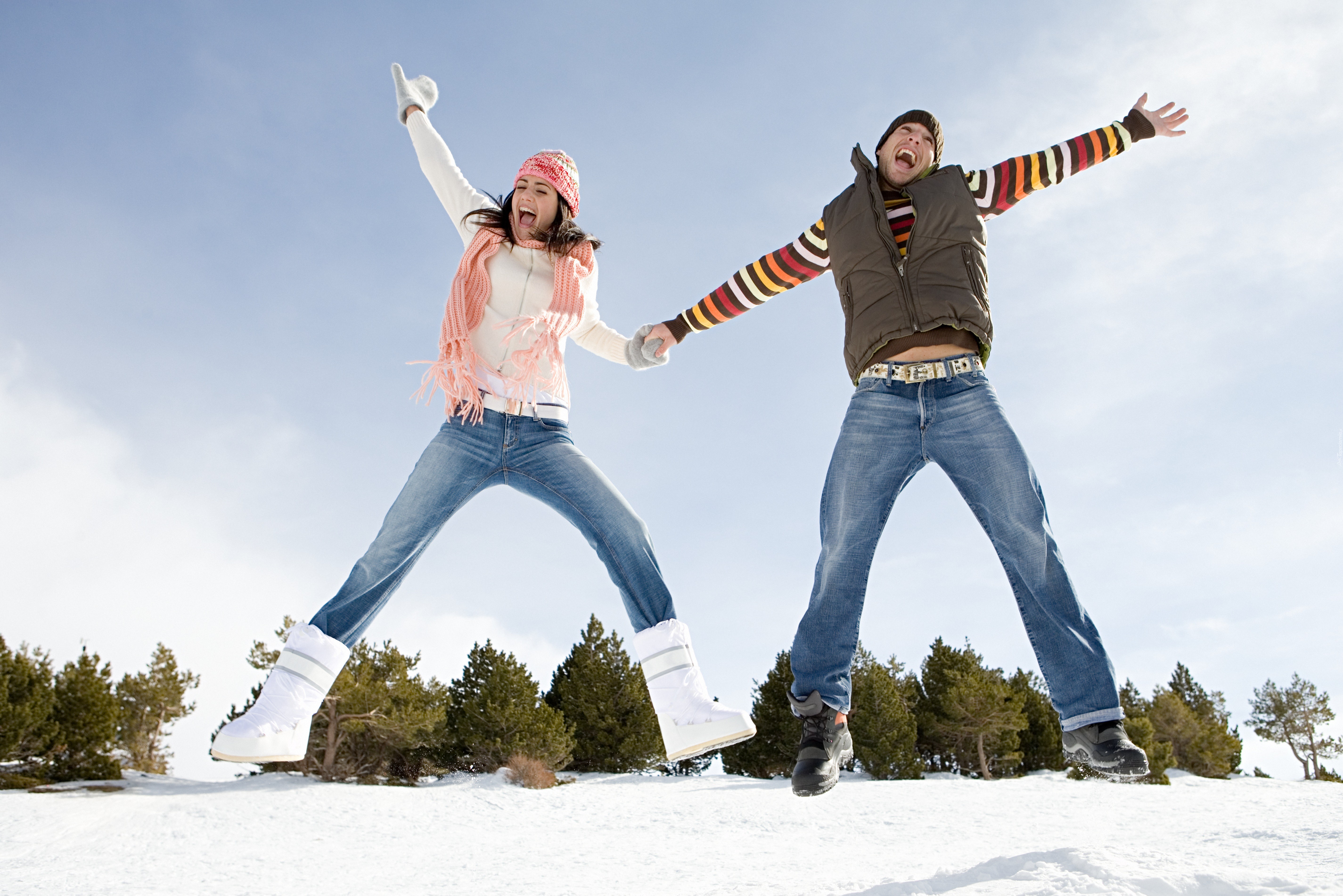 Edytor tapety: Zima, Śnieg, Para, Drzewa, Radość, Niebo