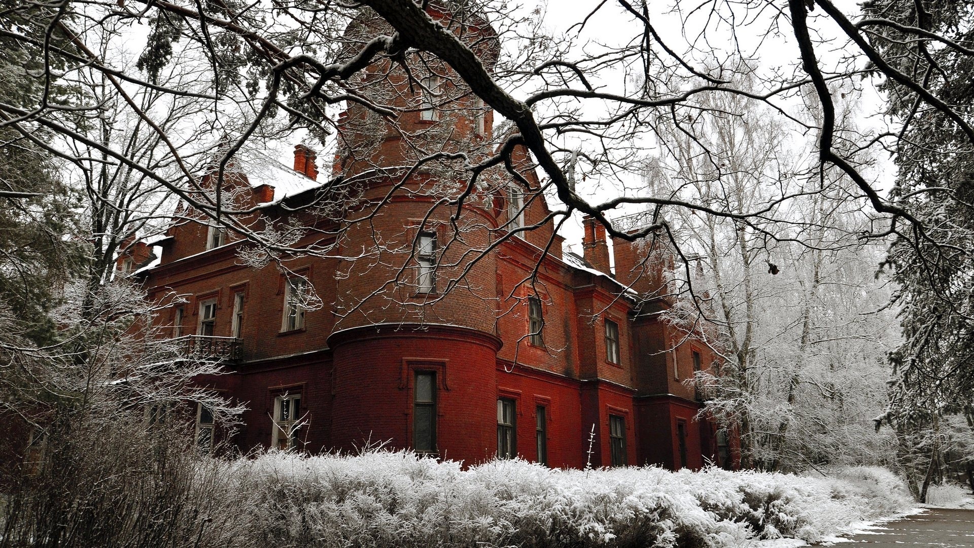 Edytor tapety: Budowla, Dom, Zima, Ośnieżone, Drzewa, Krzewy