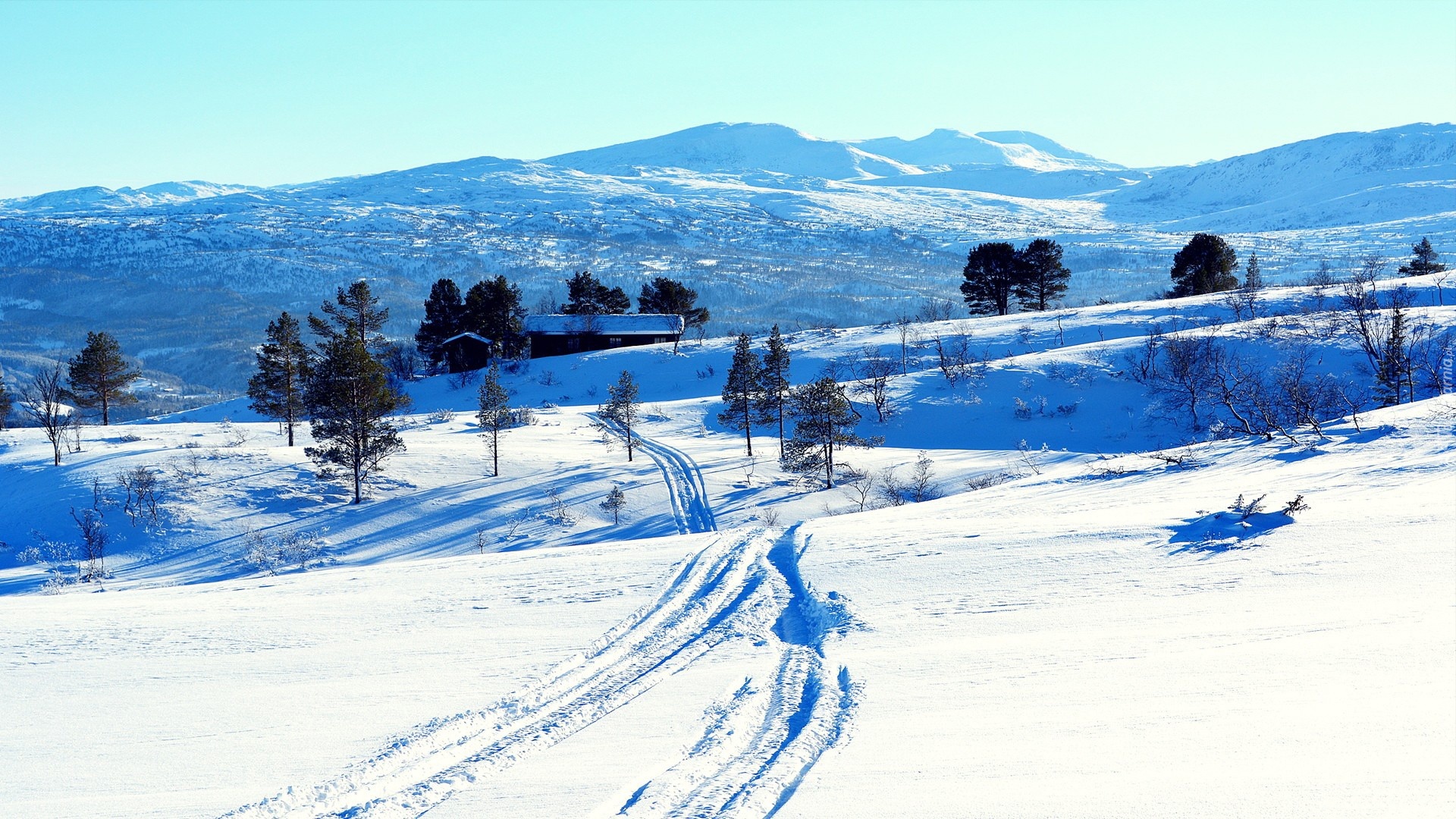 Edytor tapety: Farmy, Pola, Góry, Drzewa, Zima