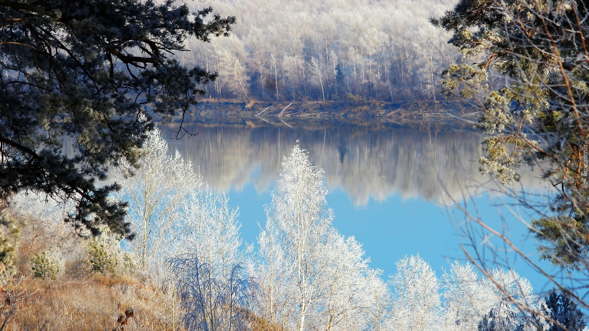 Edytor tapety: Rzeka, Lasy, Ośnieżone, Drzewa, Zima