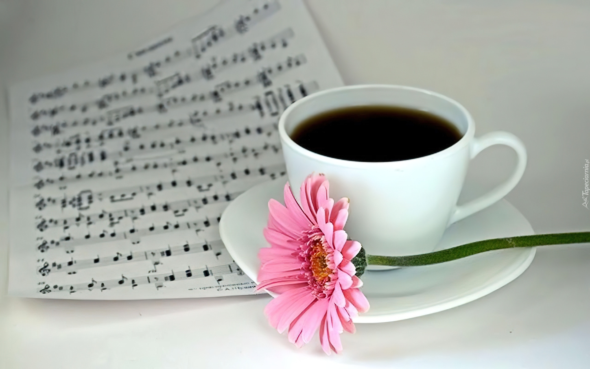 Edytor tapety: Różowa, Gerbera, Biała, Filiżanka, Talerzyk, Nuty, Kawa