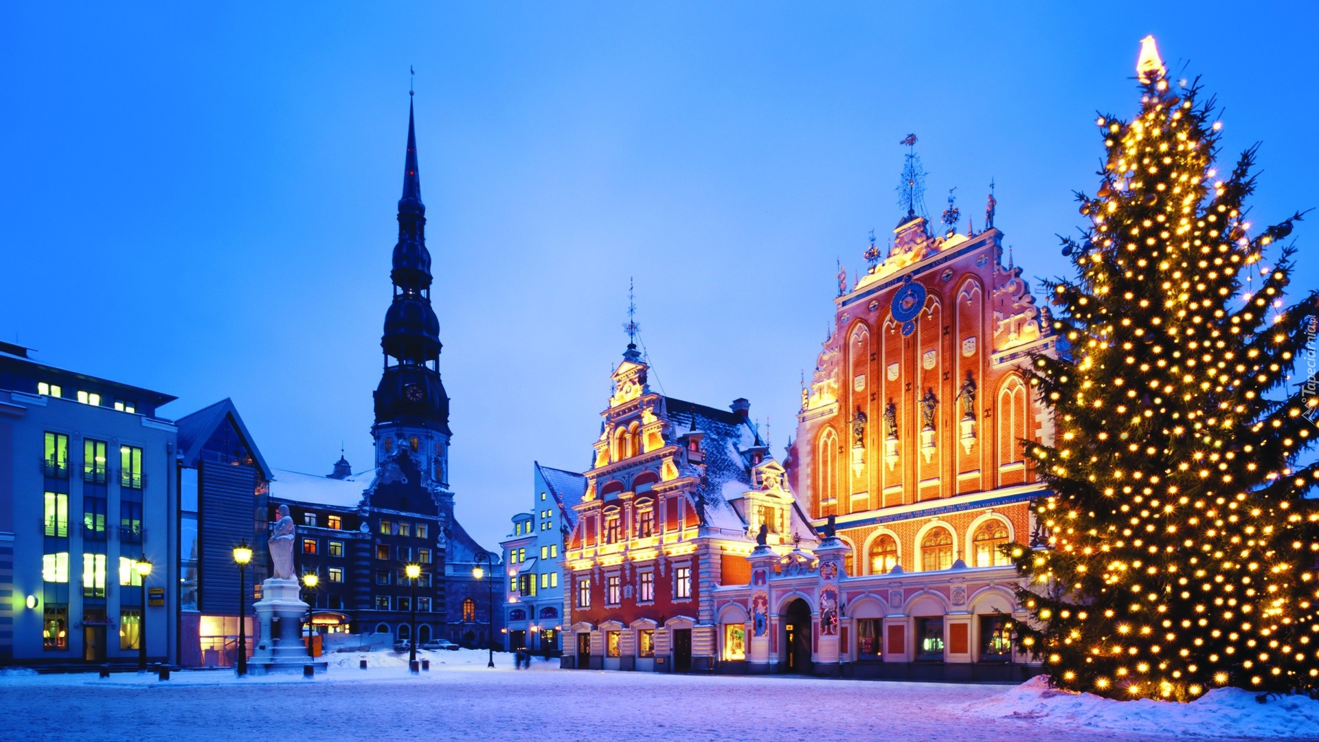 Edytor tapety: Ryga, Łotwa, Miasto, Wieczór, Choinka, Boże, Narodzenie