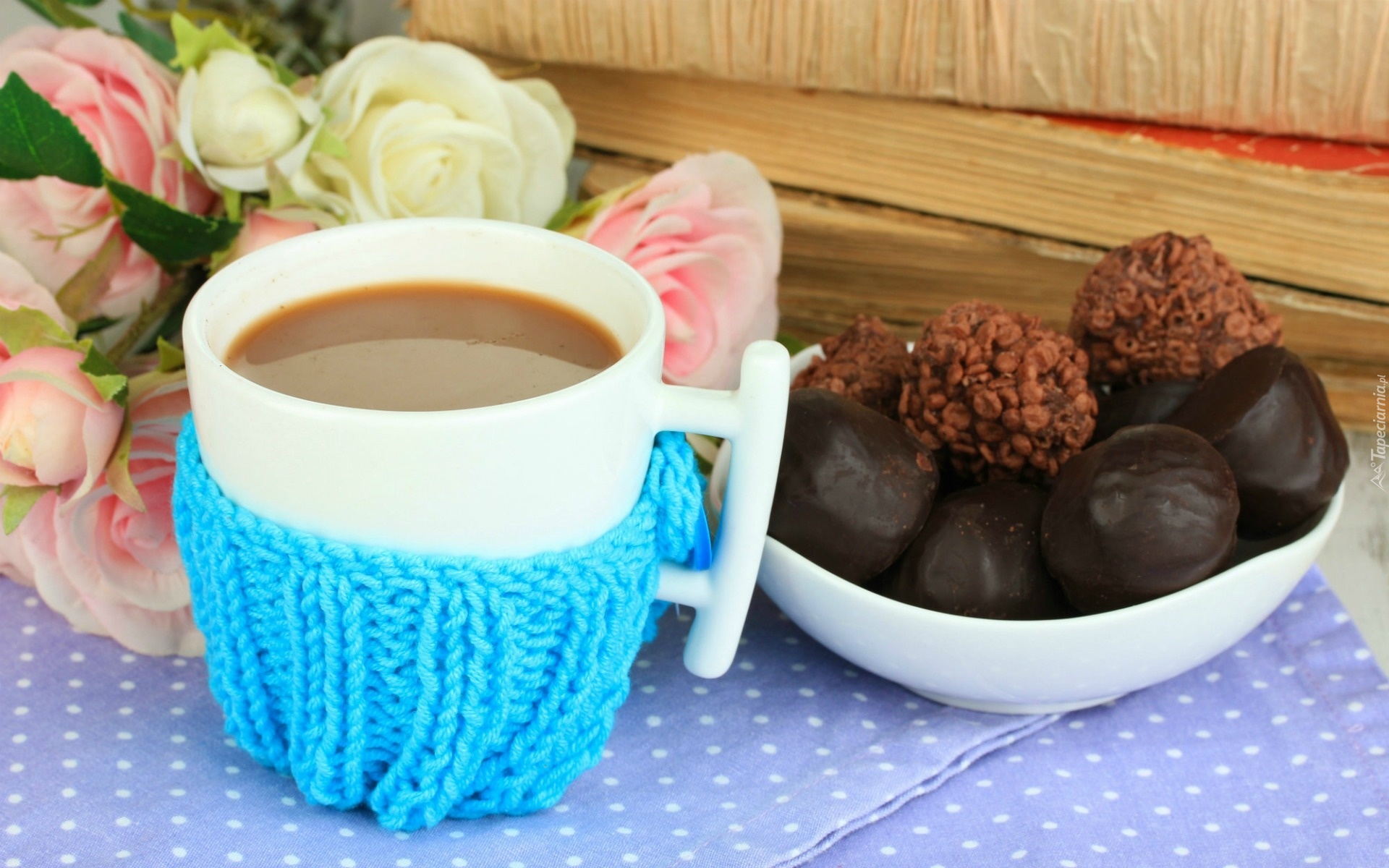 Edytor tapety: Filiżanka, Kawy, Ciasteczka, Bukiet, Róż, Książki