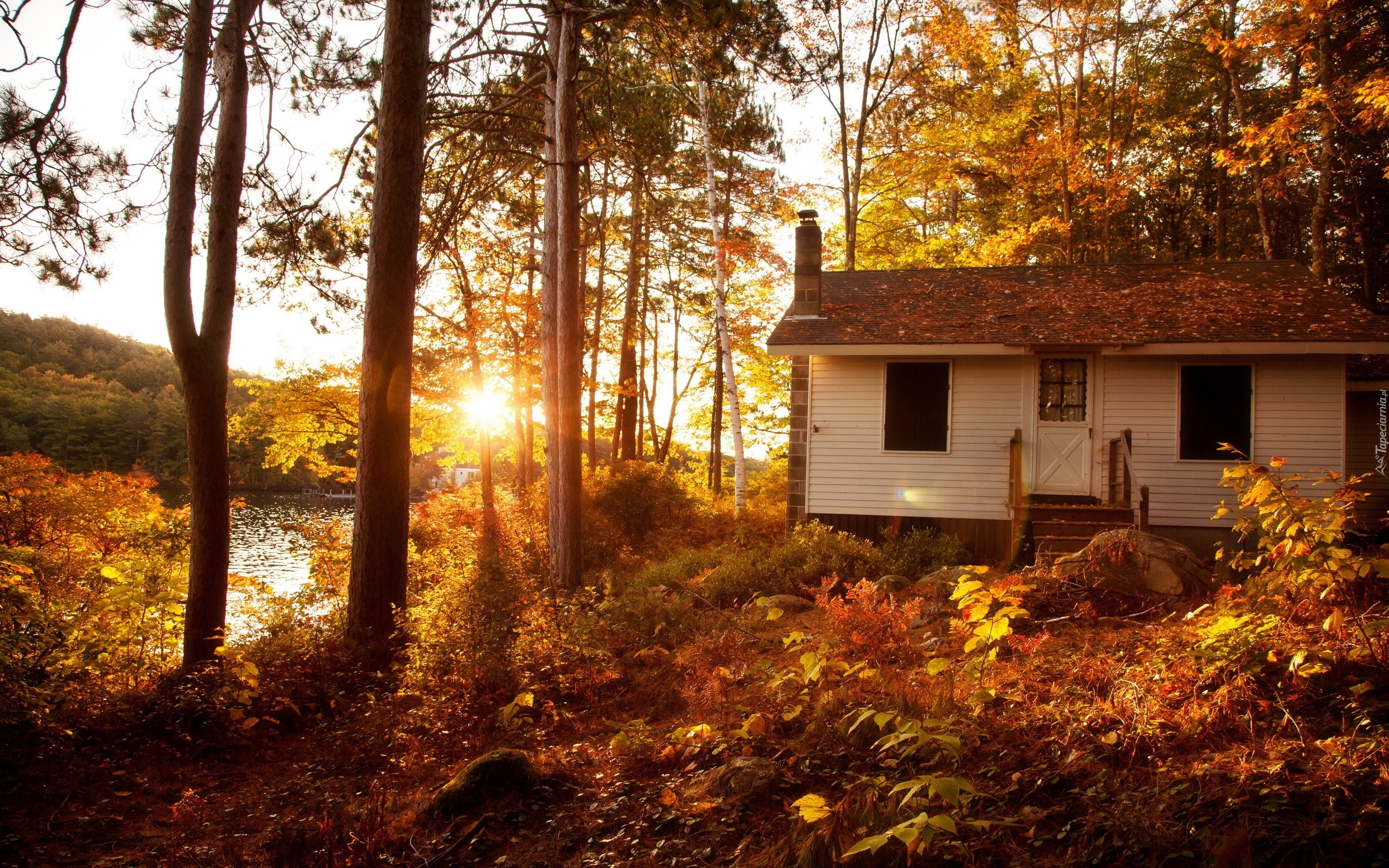 Edytor tapety: Jesień, Domek, Las, Przebijające, Światło