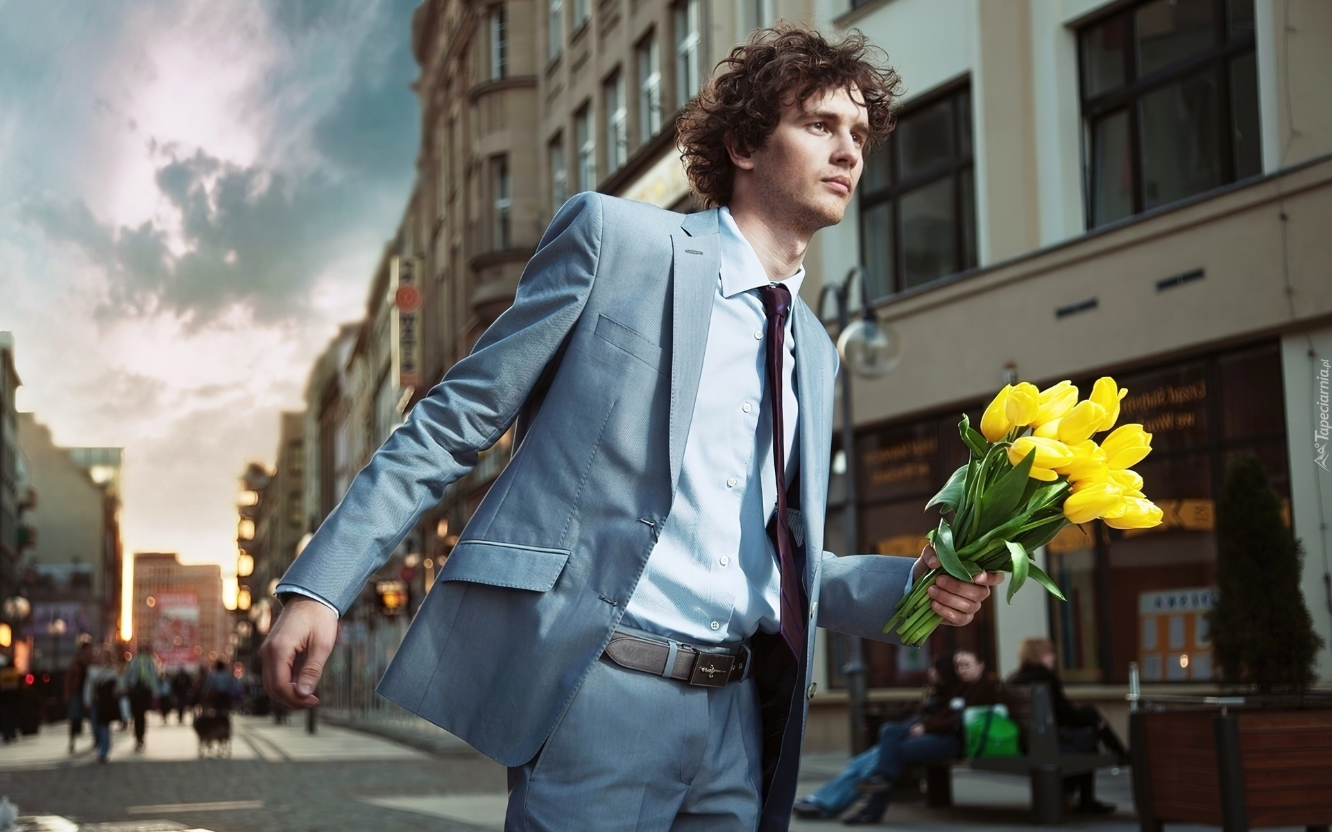 Edytor tapety: Miasto, Ulica, Mężczyzna, Garnitur, Żółte, Tulipany