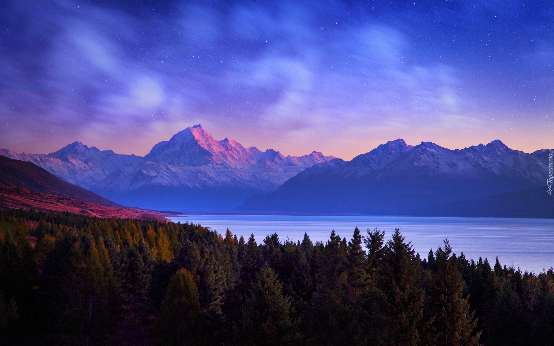 Edytor tapety: Góry, Las, Noc, Jezioro