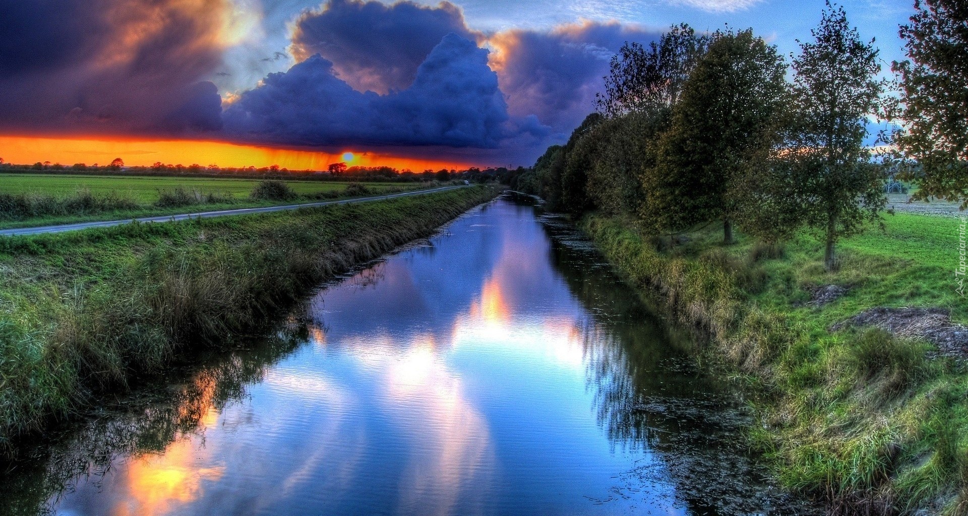 Edytor tapety: Droga, Rzeka, Zachód Słońca
