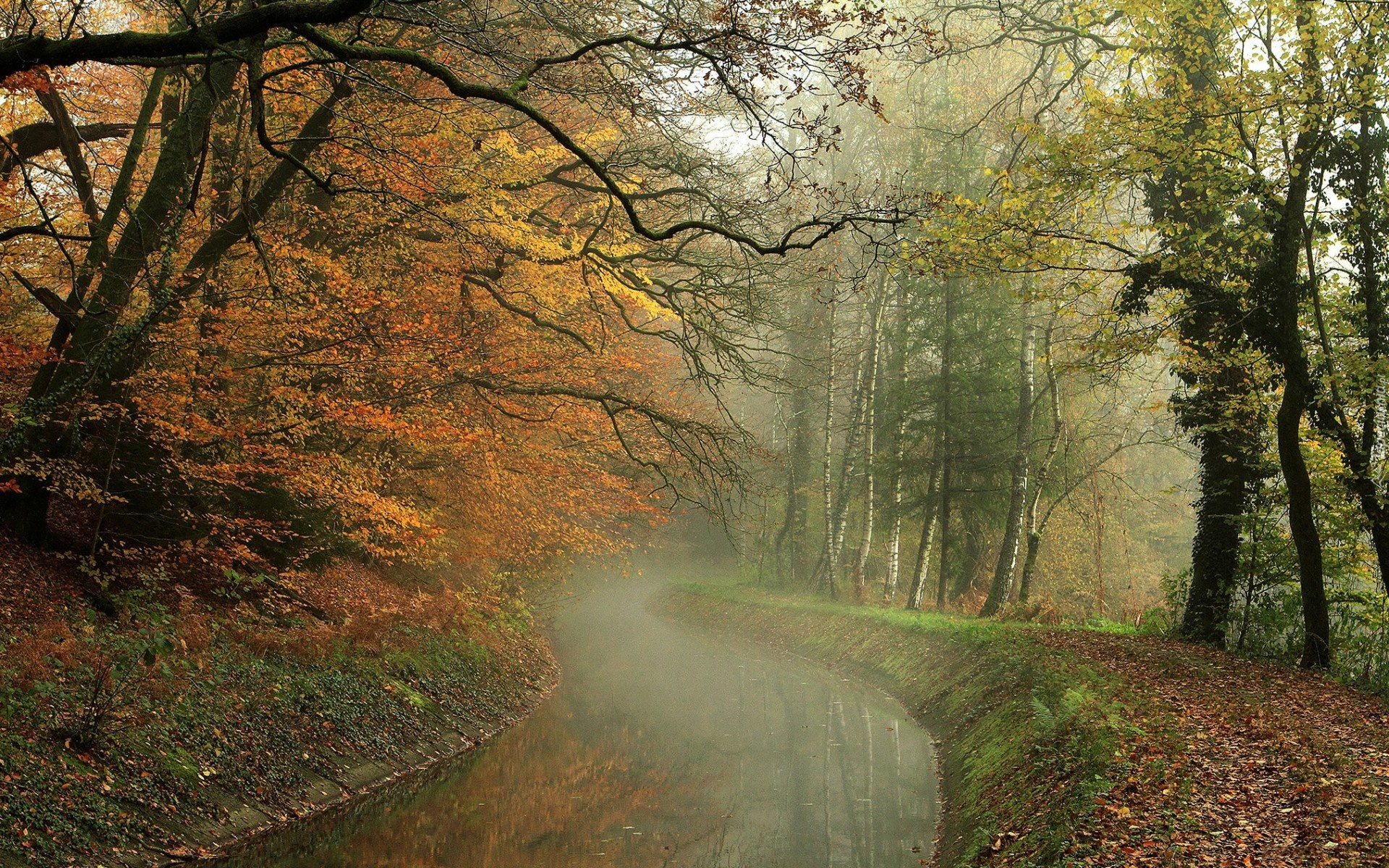 Edytor tapety: Las, Rzeka, Mgła, Liście, Jesień