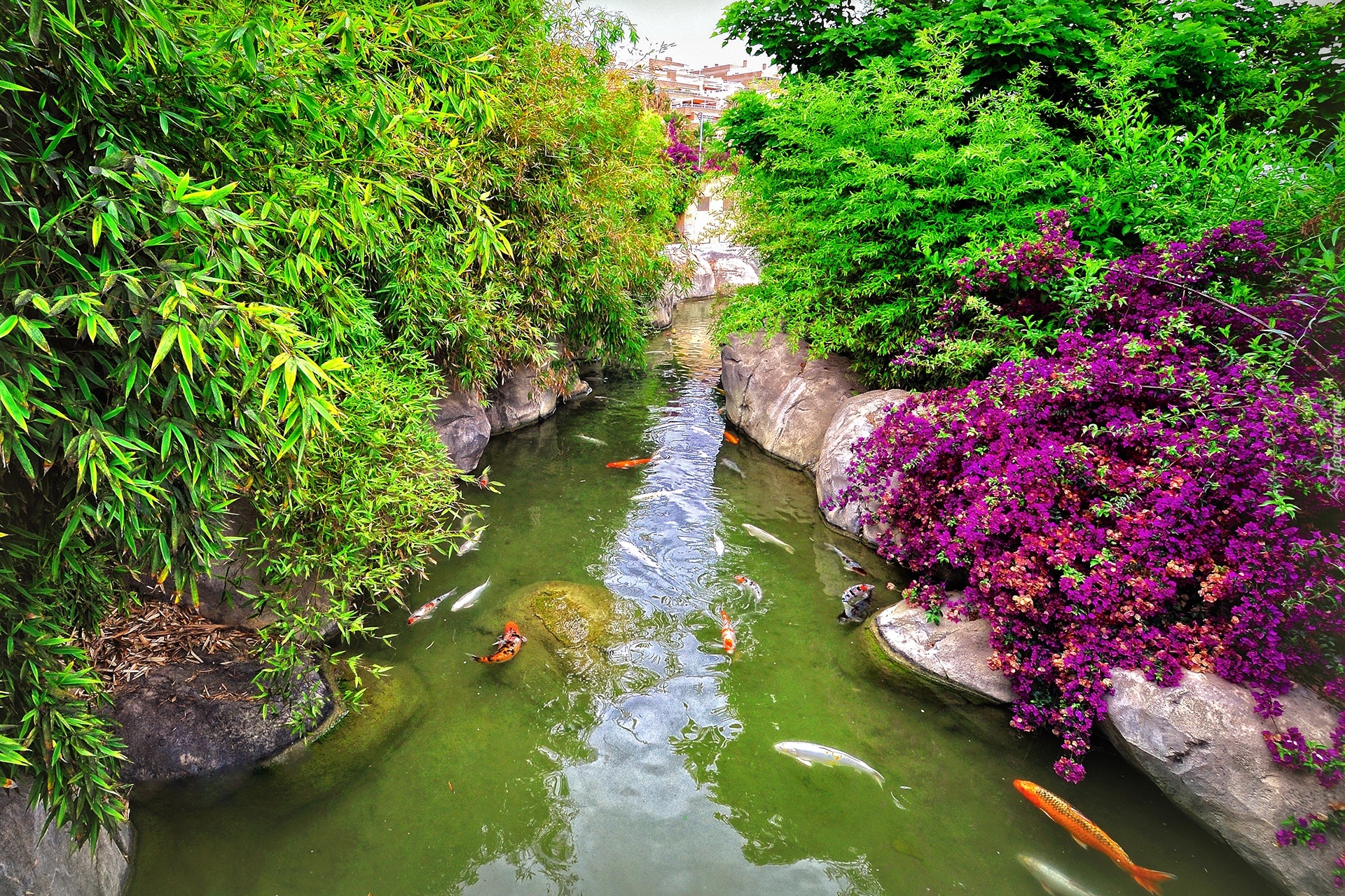 Edytor tapety: Potok, Ryby, Skały, Krzewy, Kwiaty