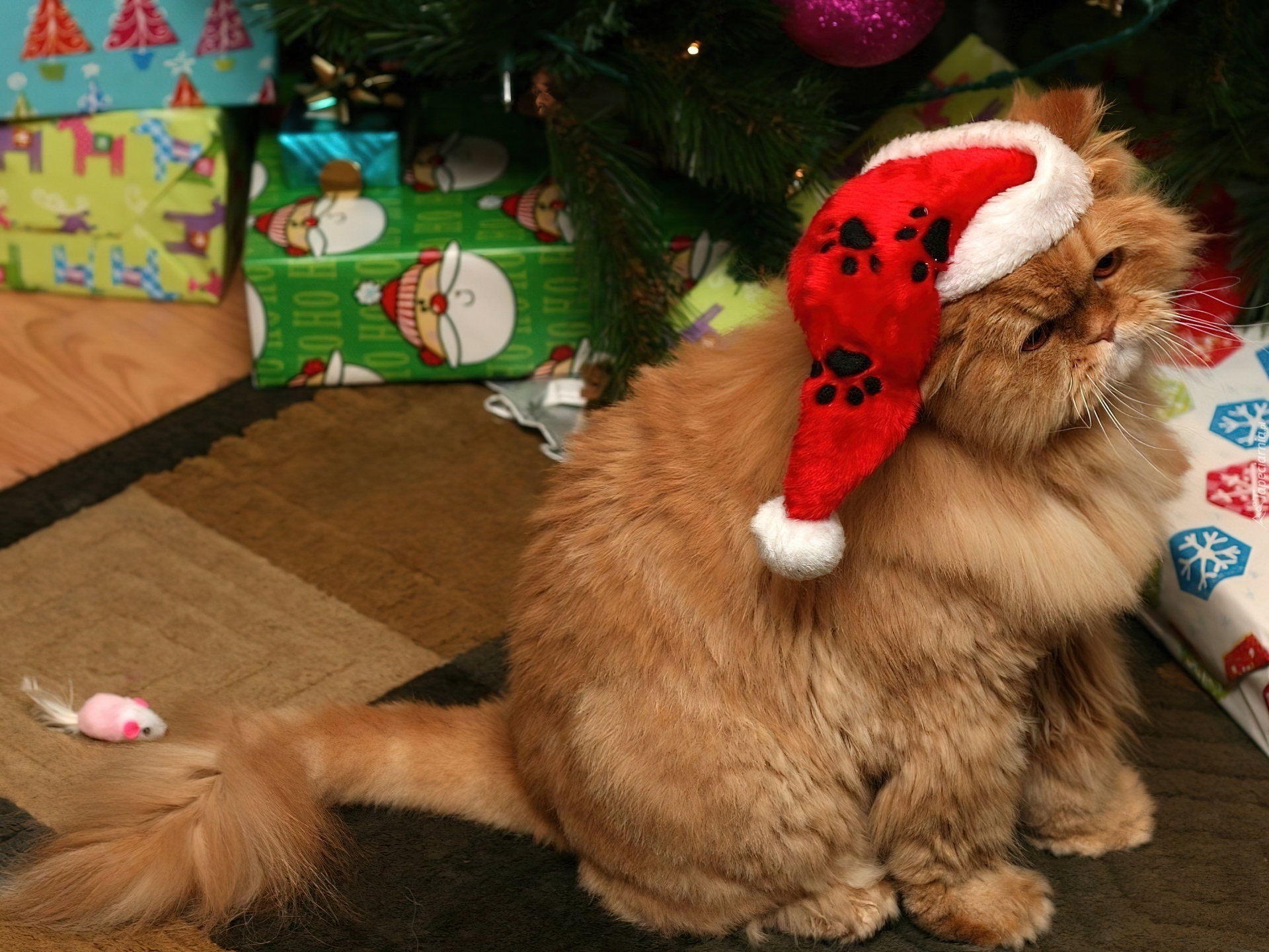 Edytor tapety: Rudy, Kot, Czapka, Mikołaja, Prezenty