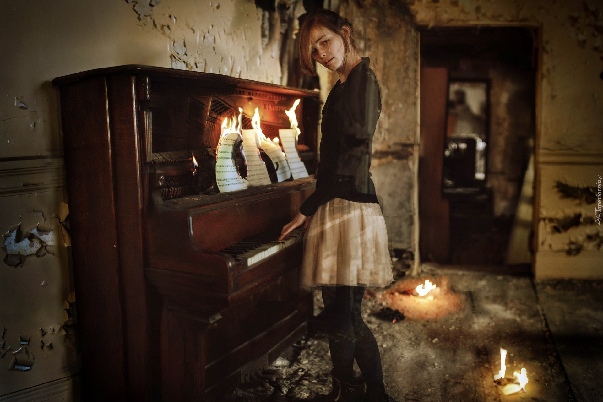 Edytor tapety: Kobieta, Pianino, Nuty, Ogień