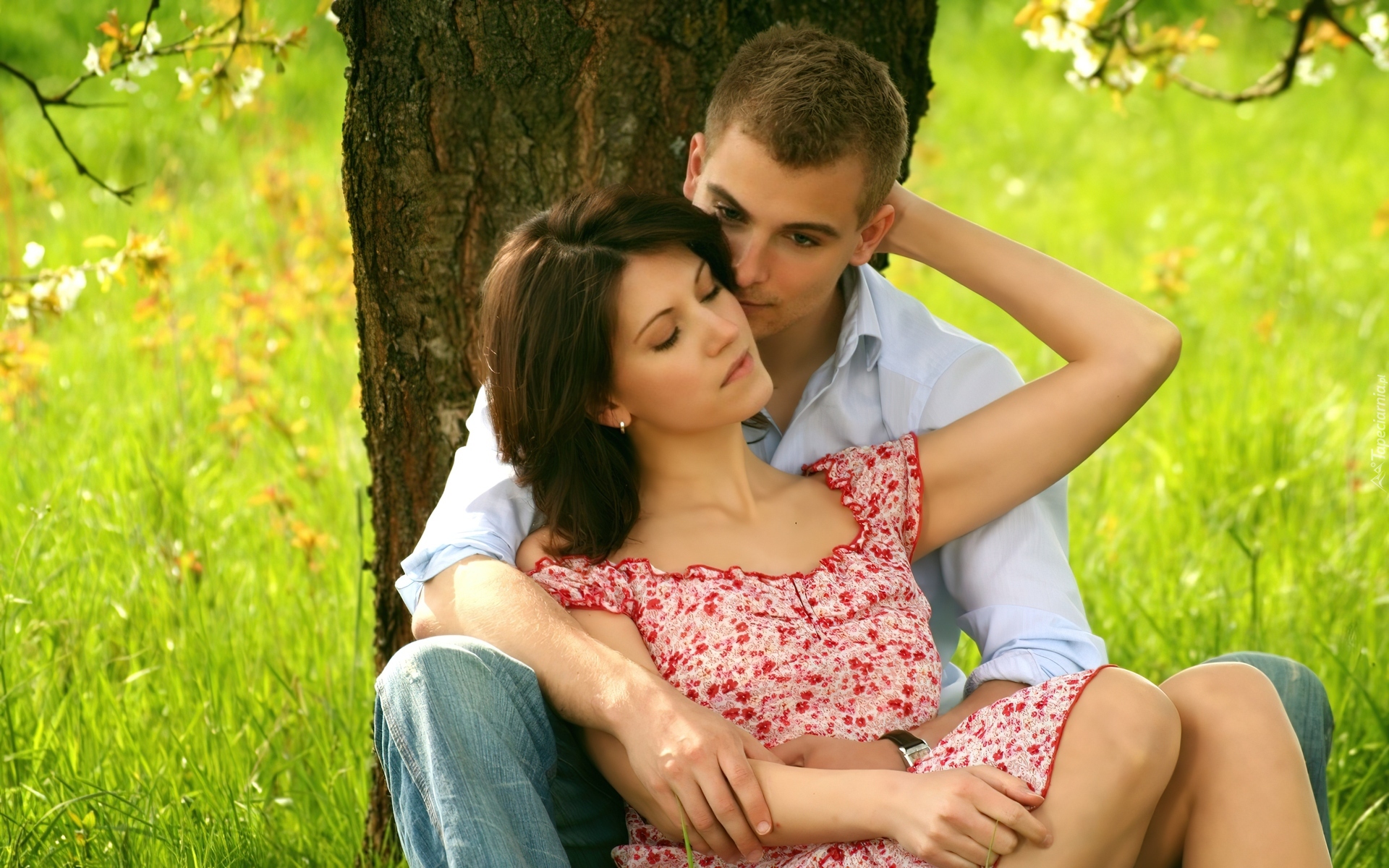 Edytor tapety: Zakochana, Para, Trawa, Drzewo