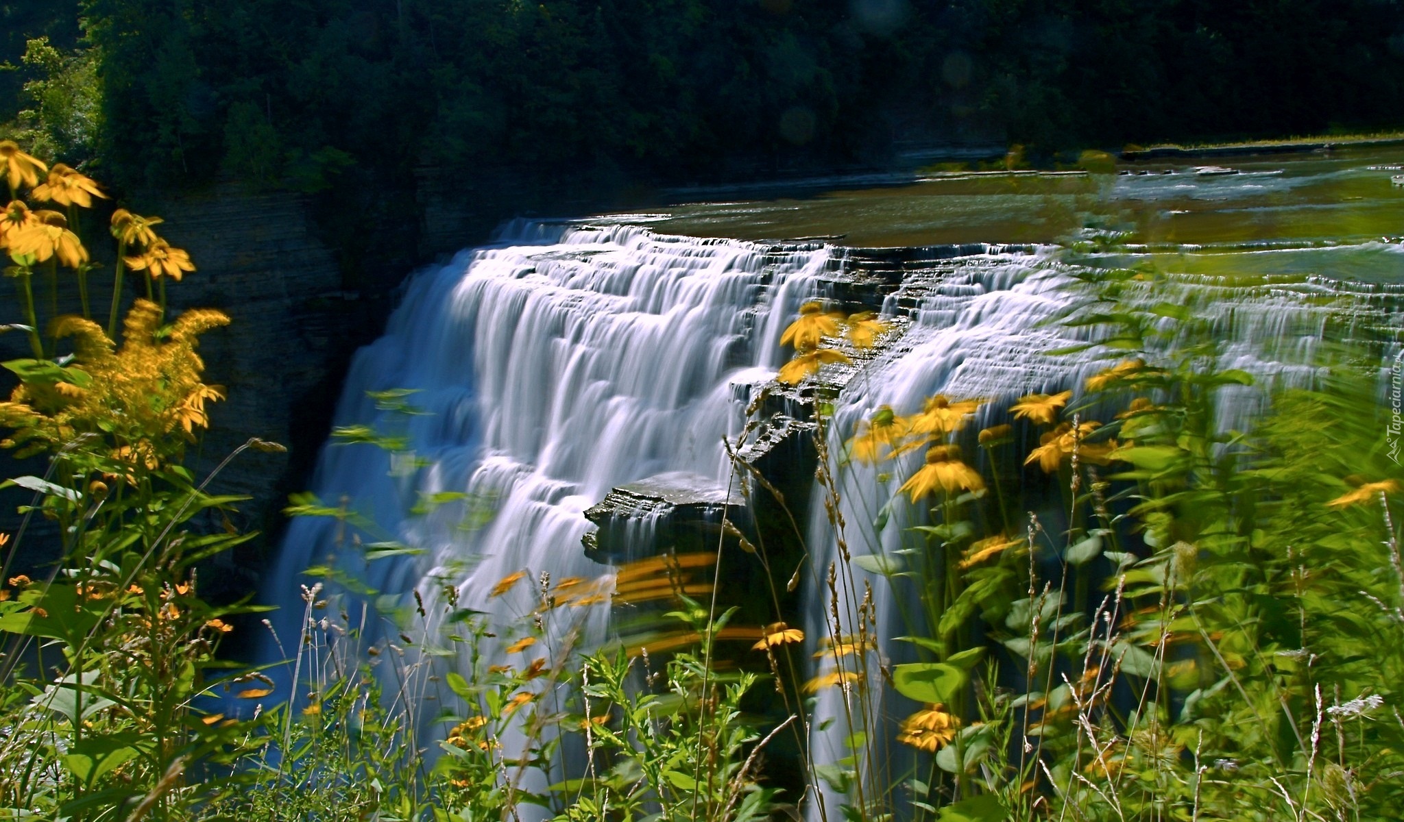 Edytor tapety: Wodospad, Skały, Kwiaty, Trawy