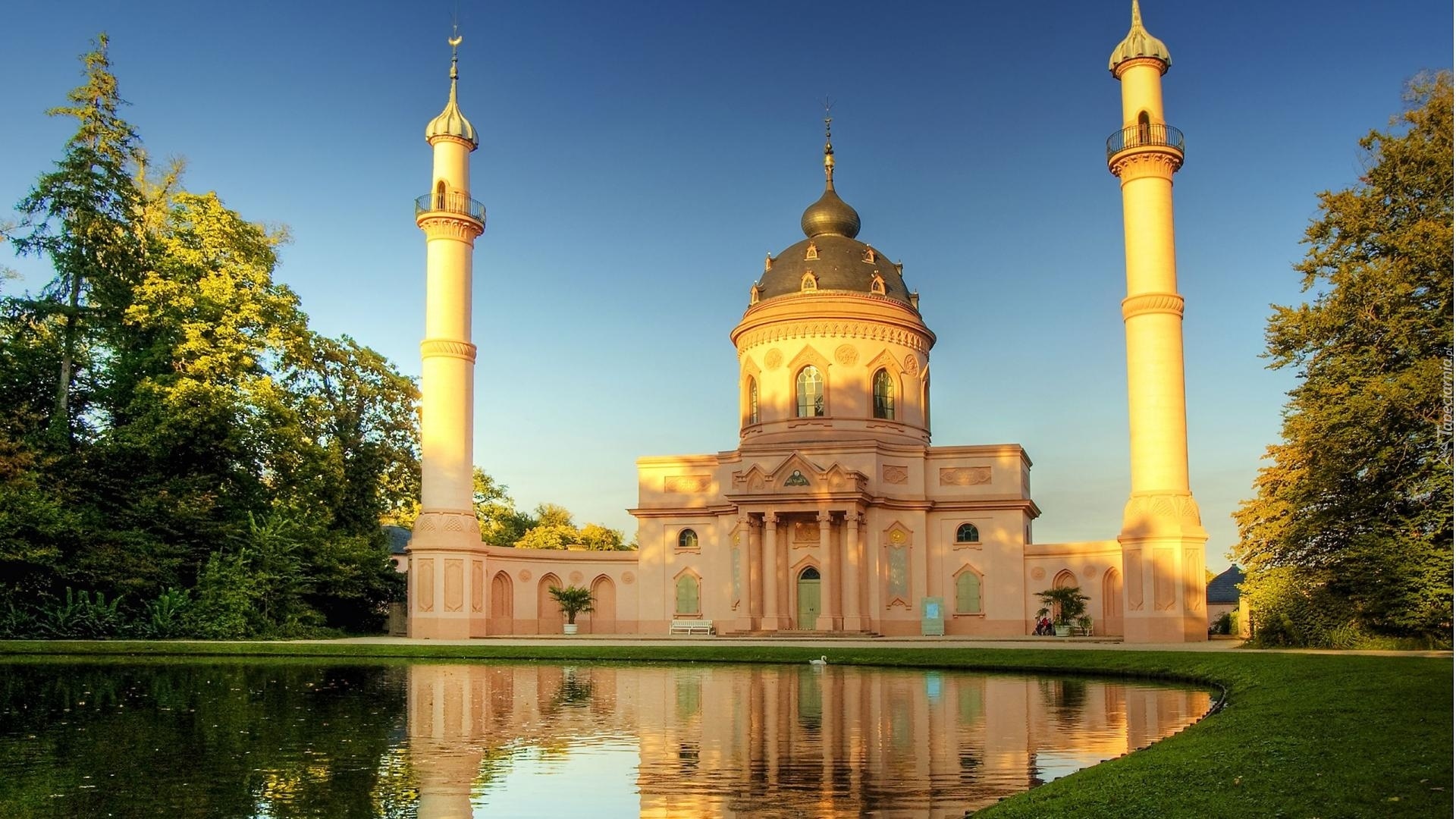 Edytor tapety: Meczet, Jeziorko, Drzewa