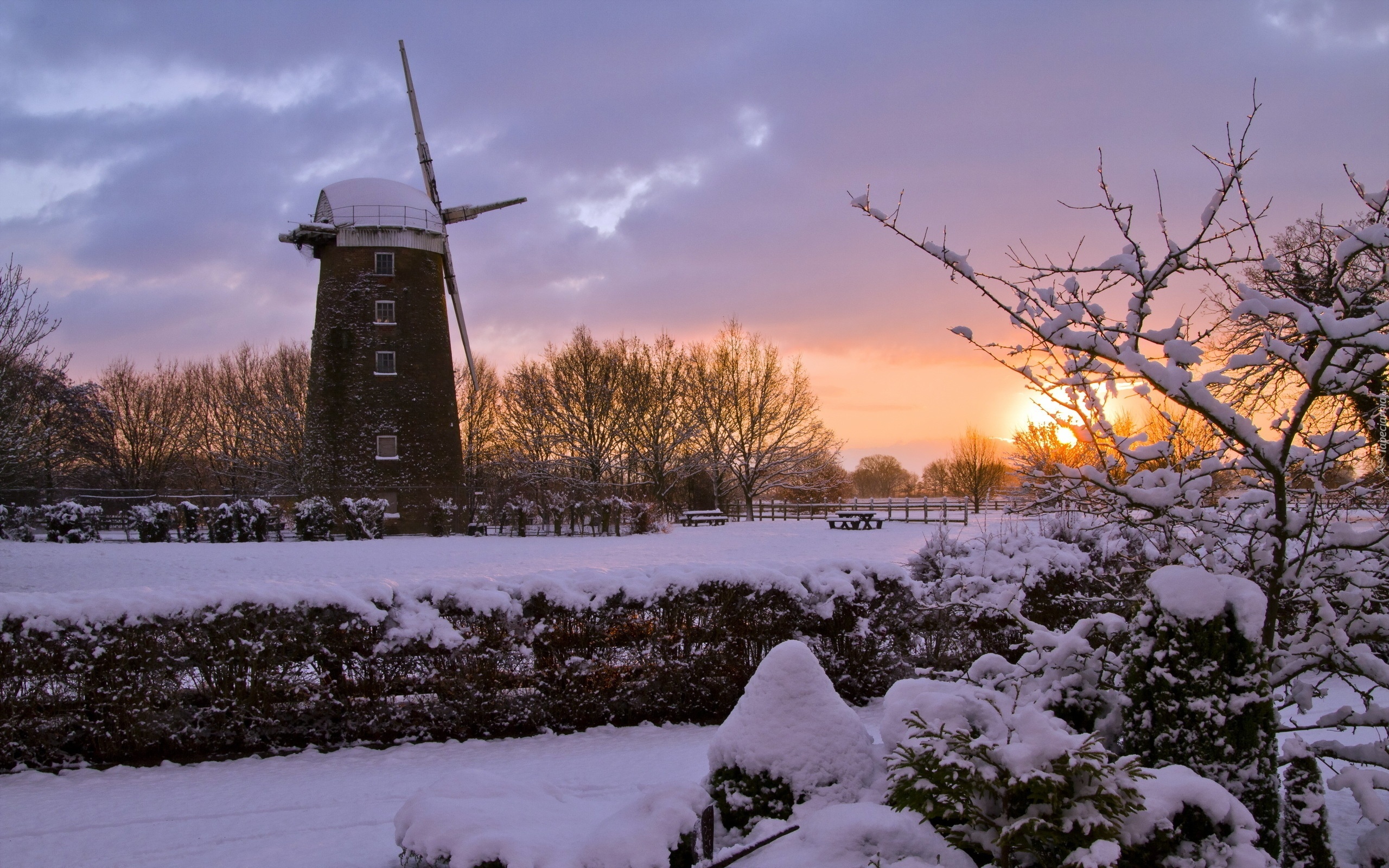 Edytor tapety: Wiatrak, Drzewa, Zachód, Słońca, Zima