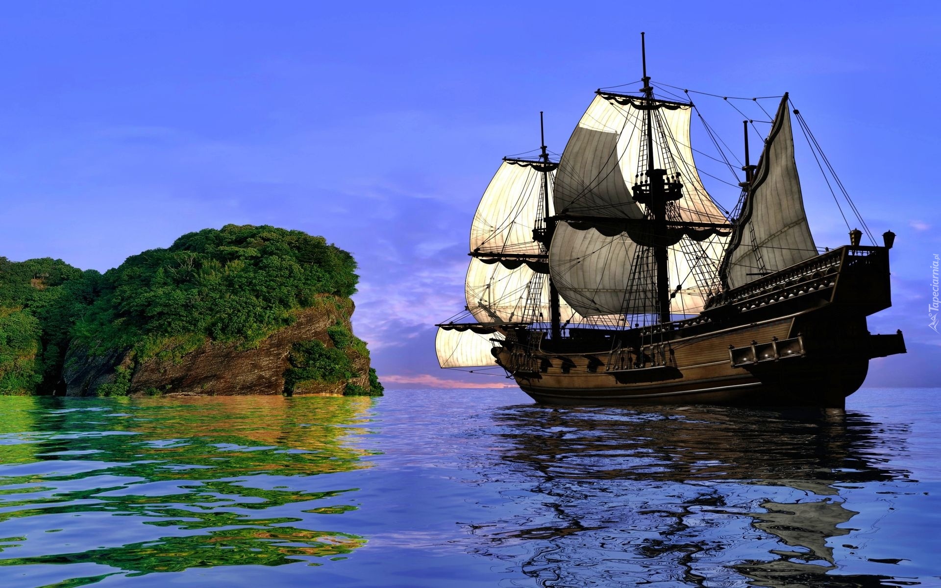 Edytor tapety: Zielona, Wyspa, Morze, Żaglowiec