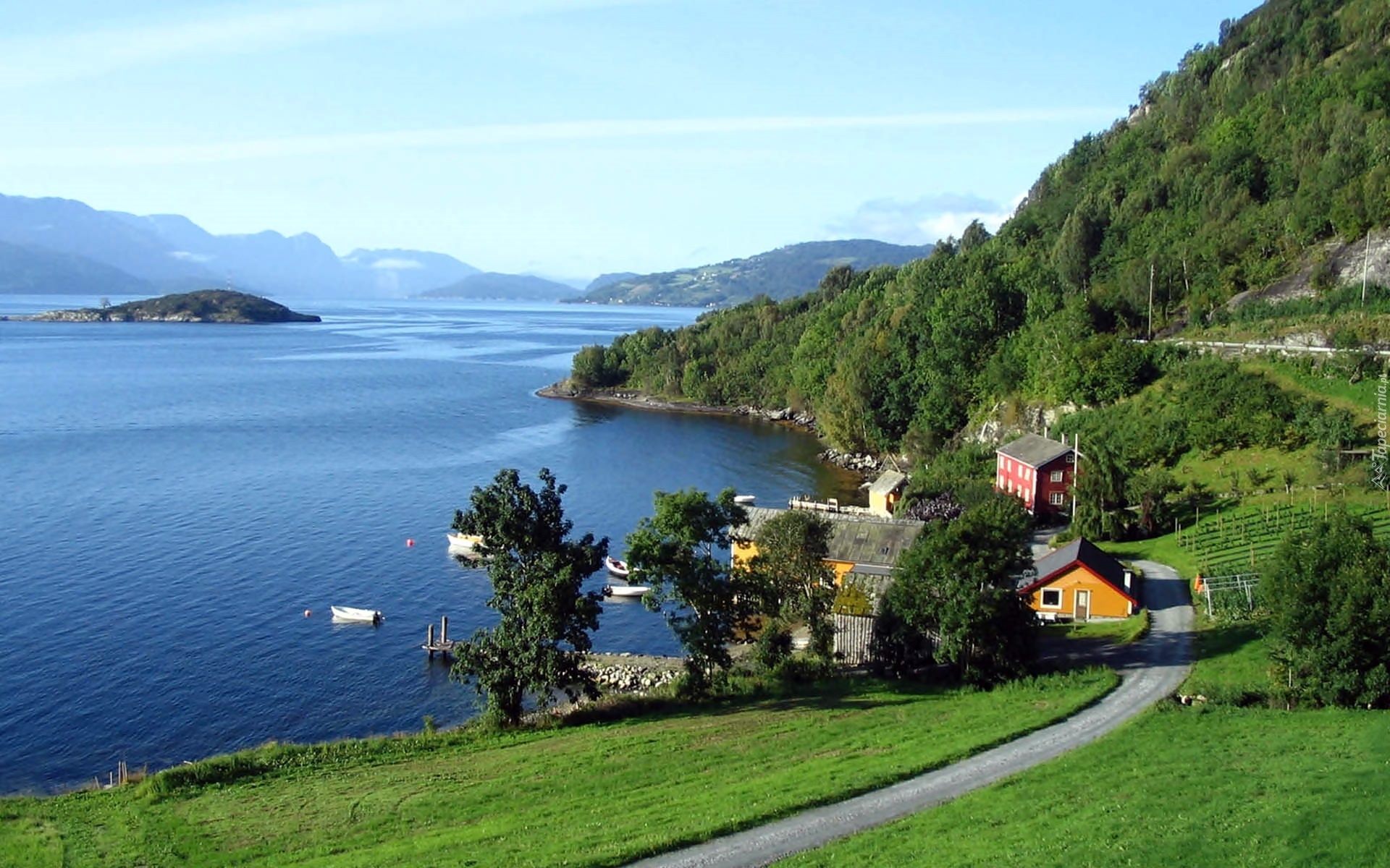 Edytor tapety: Hardangerfjord, Domy, Droga, Zalesione, Wzgórza