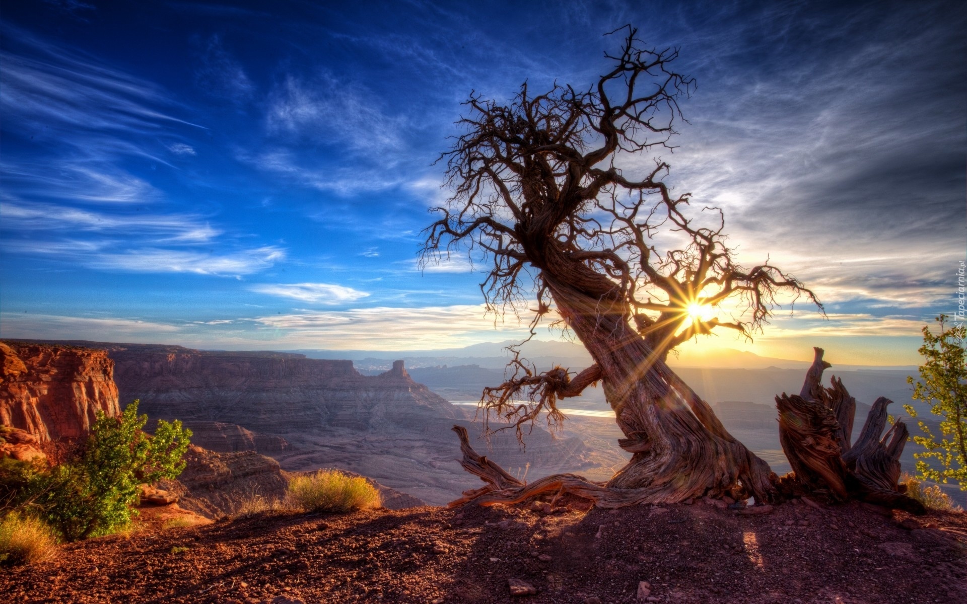 Edytor tapety: Kanion, Drzewo, Zachód, Słońca, Promienie