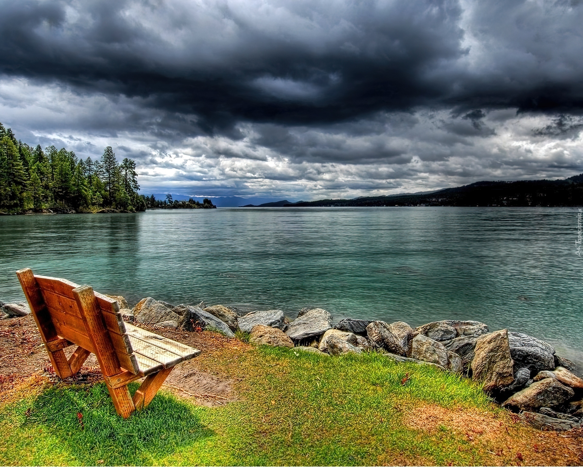Edytor tapety: Jezioro, Chmury, Ławka, Kamienie