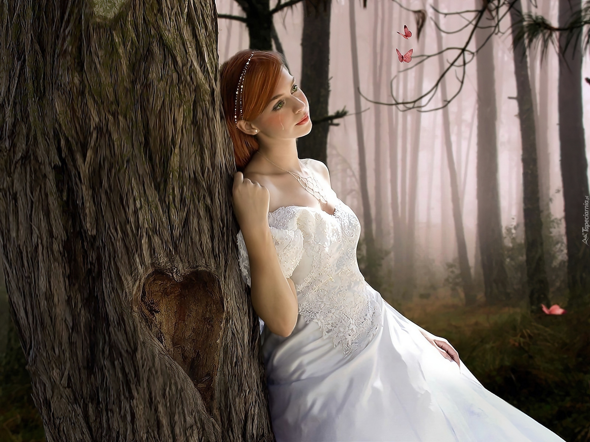 Edytor tapety: Las, Mgła, Płacząca, Dziewczyna, Biała, Sukienka
