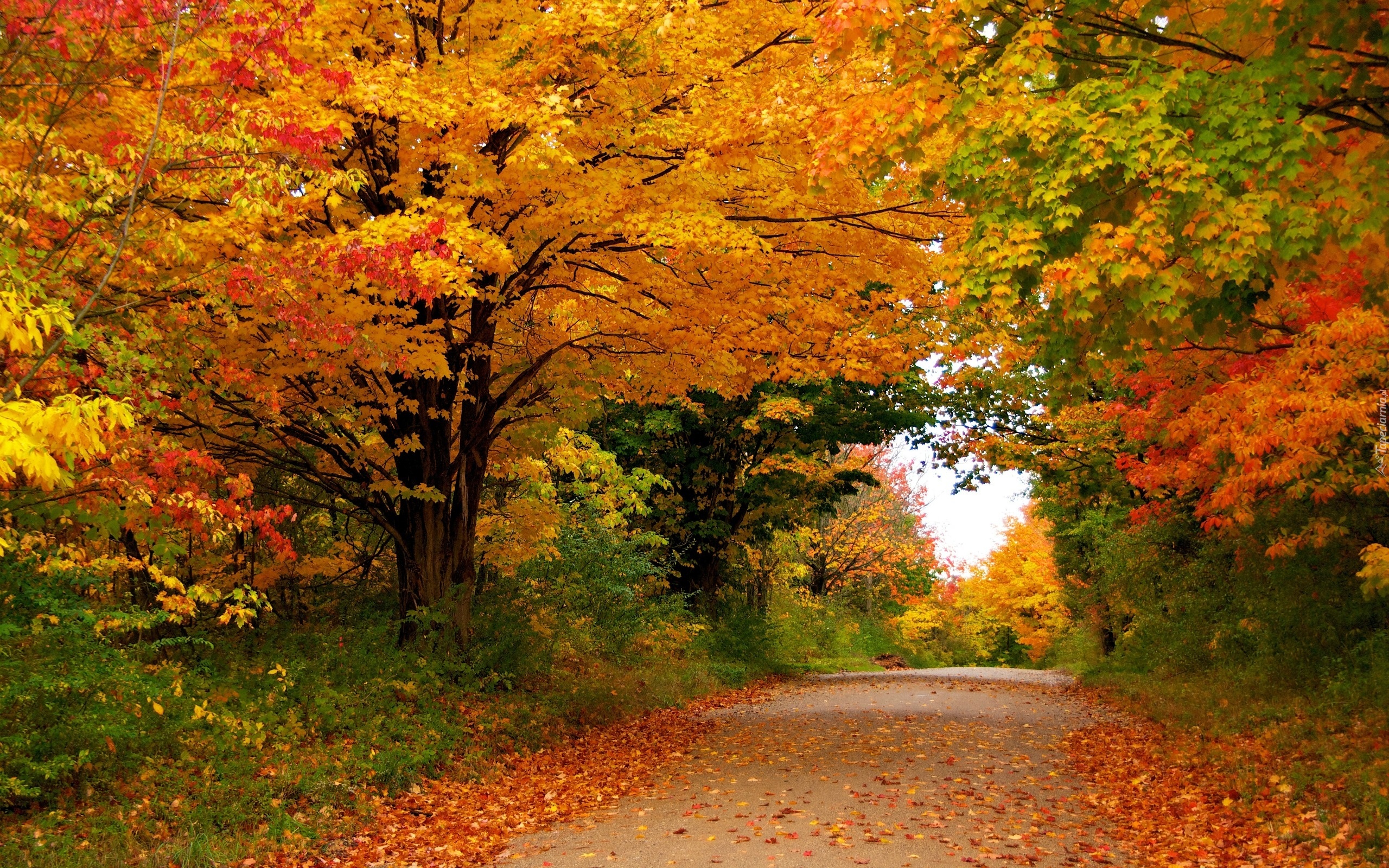 Edytor tapety: Droga, Las, Kolorowe, Drzewa, Liście, Jesień